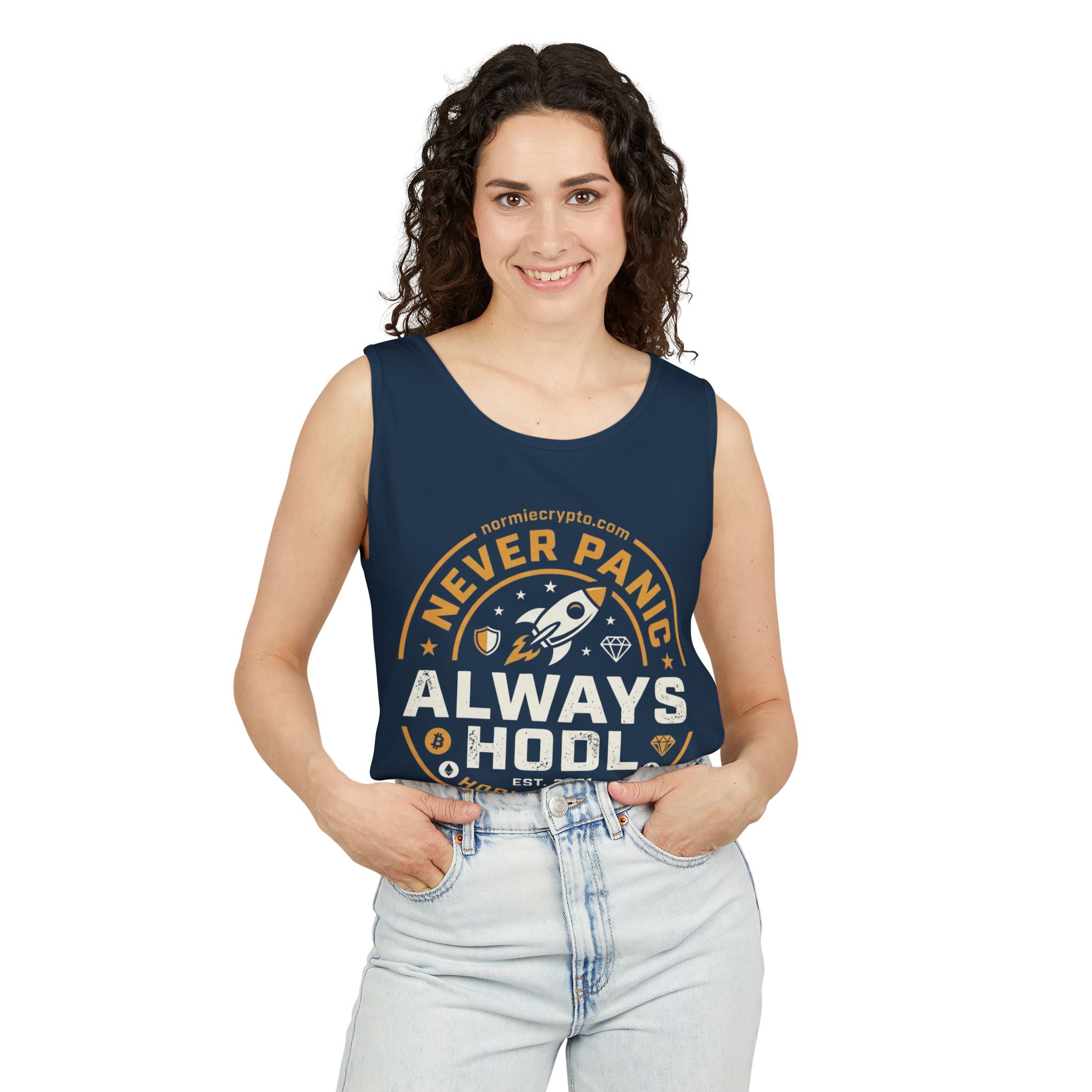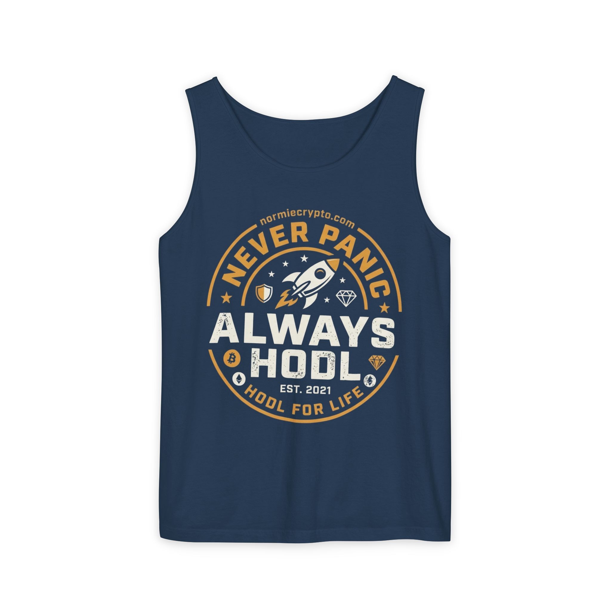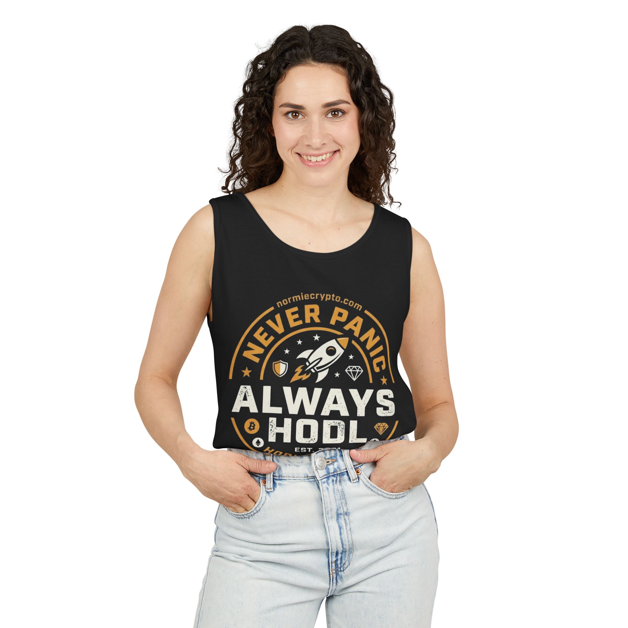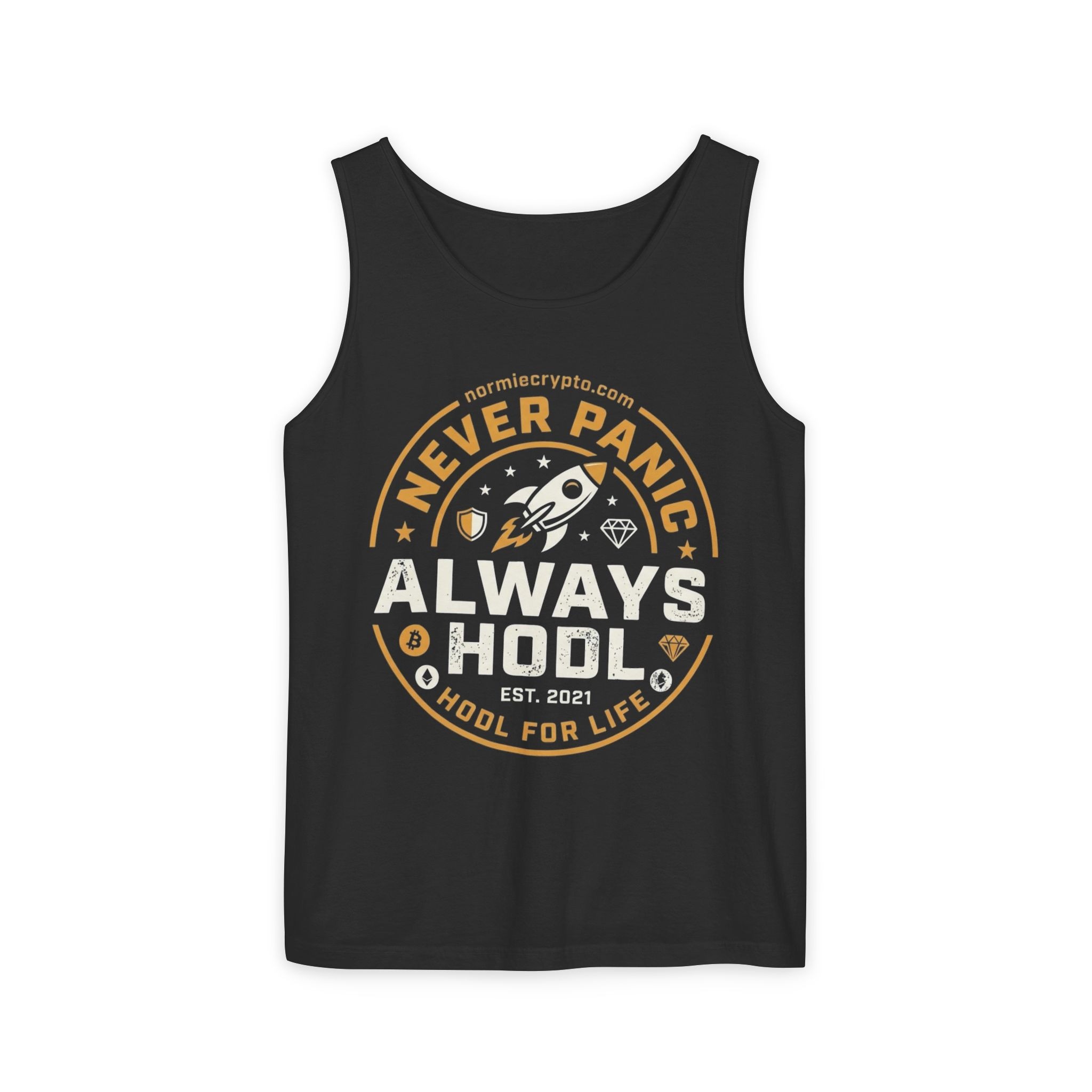 A relaxed, garment-dyed tank that wears in like a favorite old tee and carries a playful, crypto-inspired vibe. Soft, midweight ringspun cotton drapes casually over the shoulders while the muted dye and simple screenprint announce, “Never Panic — Always HODL.” Short, confident sentences evoke post-trade calm: a slow breath after market dips, a laugh with friends about long-term patience, a daily reminder to stay steady. The cut is roomy without feeling oversized; the seamless tube knit keeps lines clean and fuss-free. Wear it to meetups, weekend runs, or as a layering piece under a hoodie when evening charts roll in. The small printed tag and subtle back QR add a modern, maker-focused touch that speaks to folks who live between code, coffee, and community.