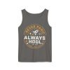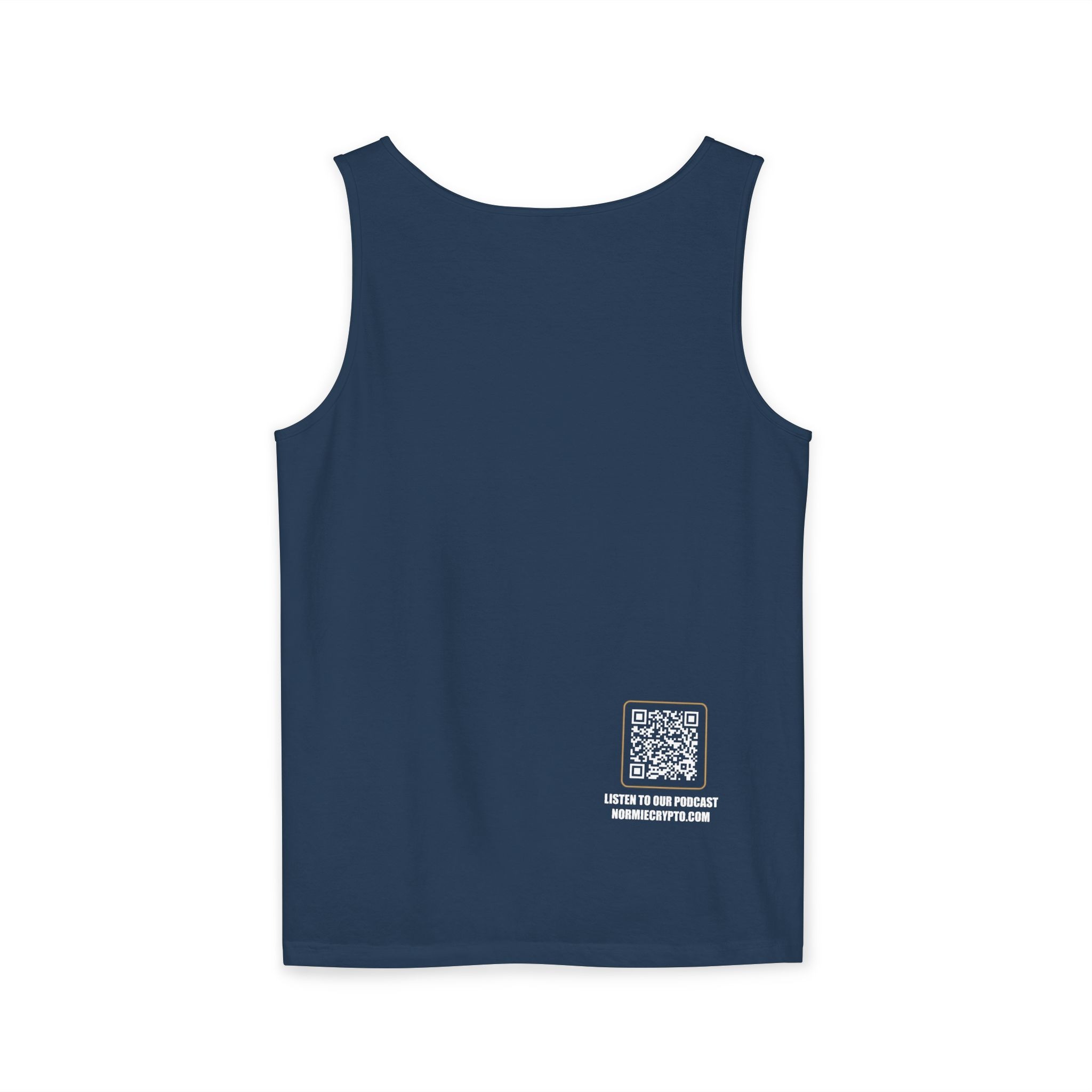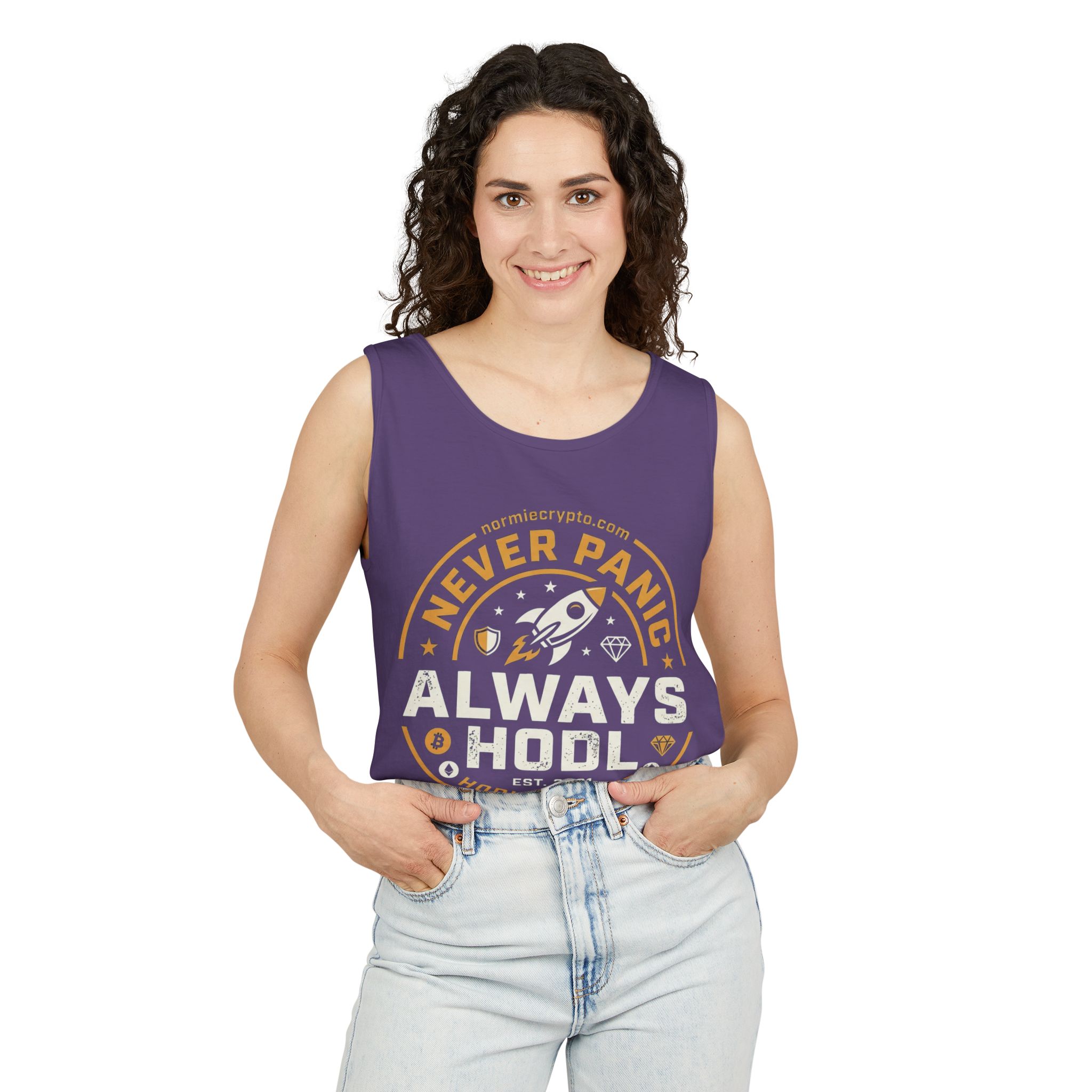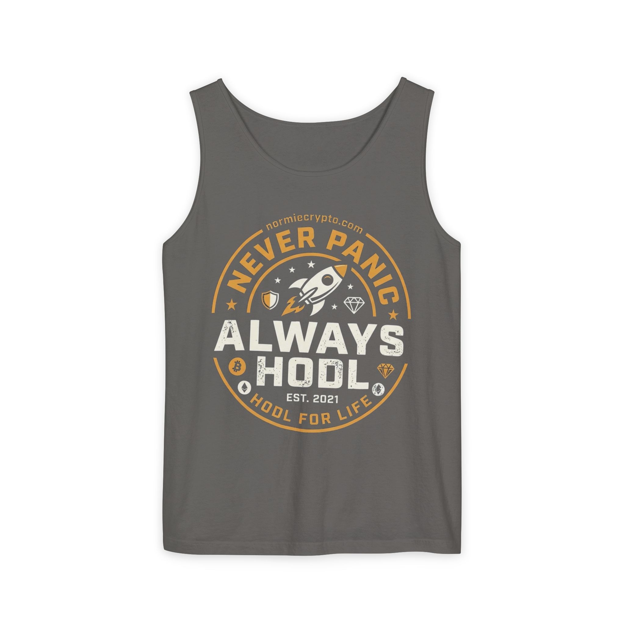 A relaxed, garment-dyed tank that wears in like a favorite old tee and carries a playful, crypto-inspired vibe. Soft, midweight ringspun cotton drapes casually over the shoulders while the muted dye and simple screenprint announce, “Never Panic — Always HODL.” Short, confident sentences evoke post-trade calm: a slow breath after market dips, a laugh with friends about long-term patience, a daily reminder to stay steady. The cut is roomy without feeling oversized; the seamless tube knit keeps lines clean and fuss-free. Wear it to meetups, weekend runs, or as a layering piece under a hoodie when evening charts roll in. The small printed tag and subtle back QR add a modern, maker-focused touch that speaks to folks who live between code, coffee, and community.