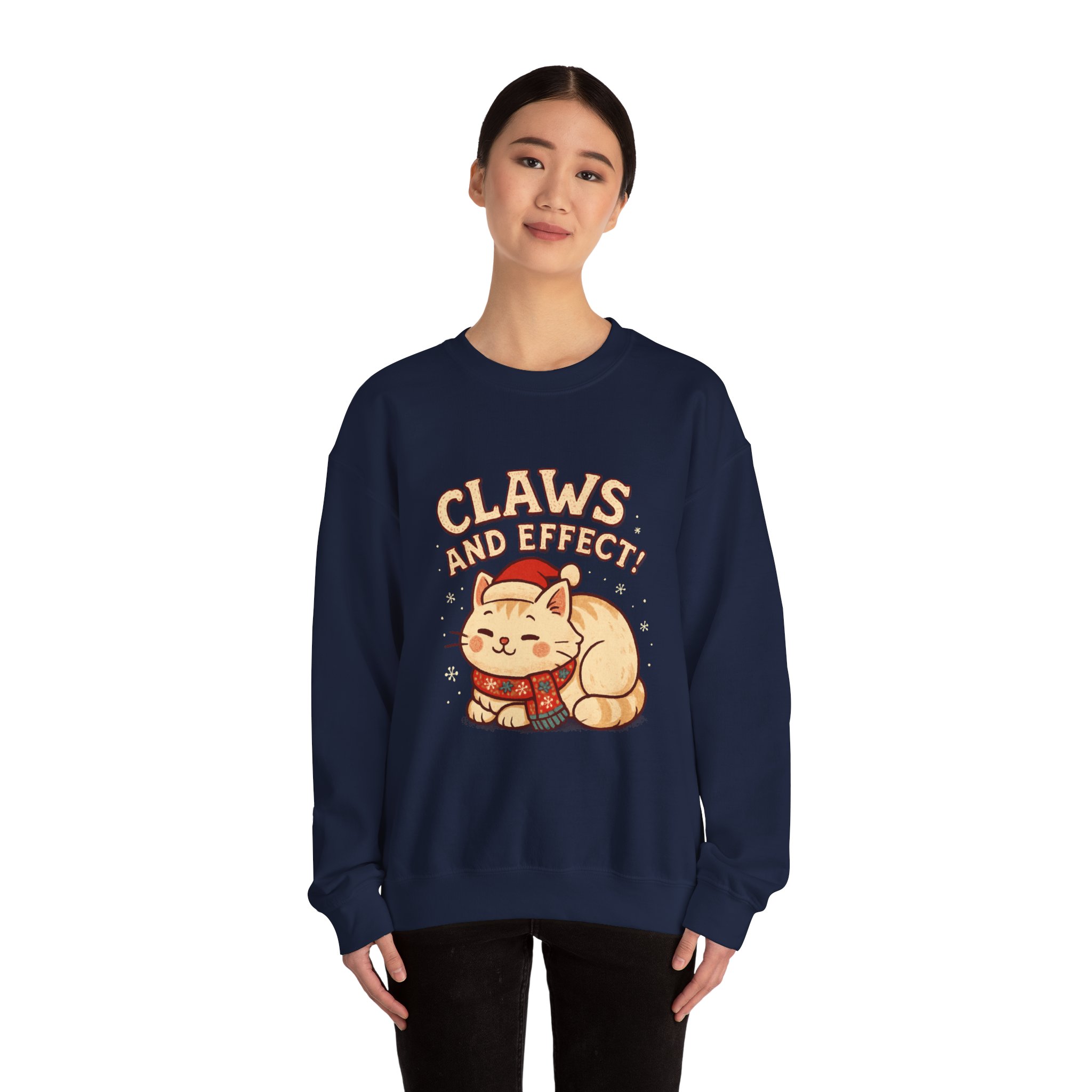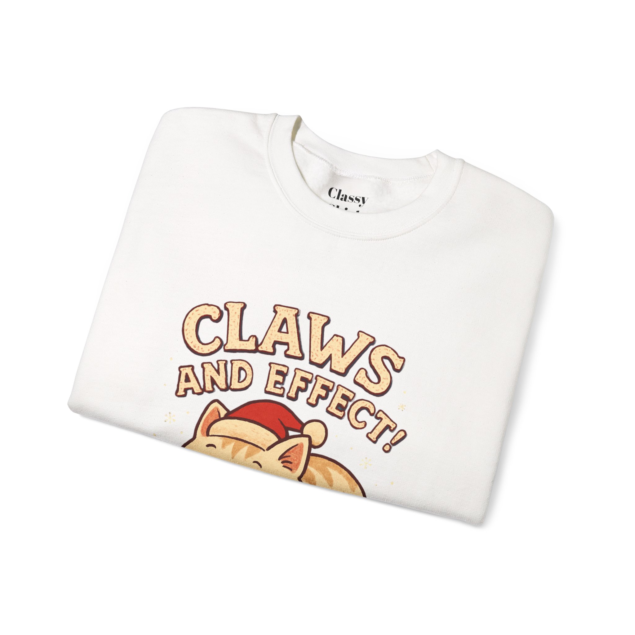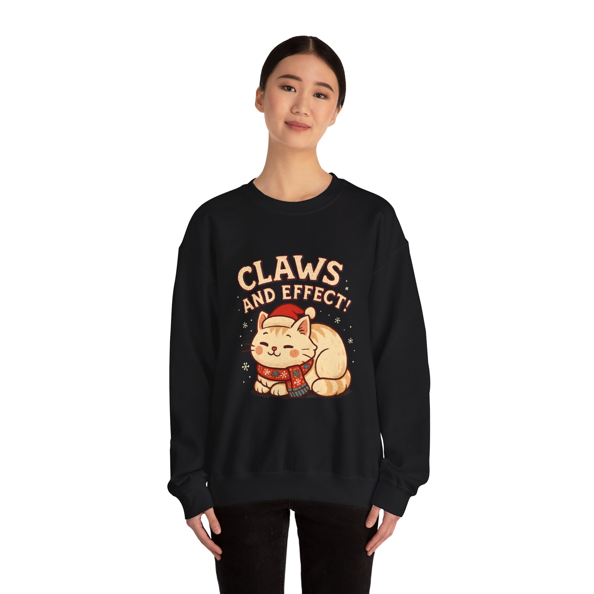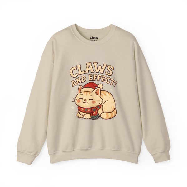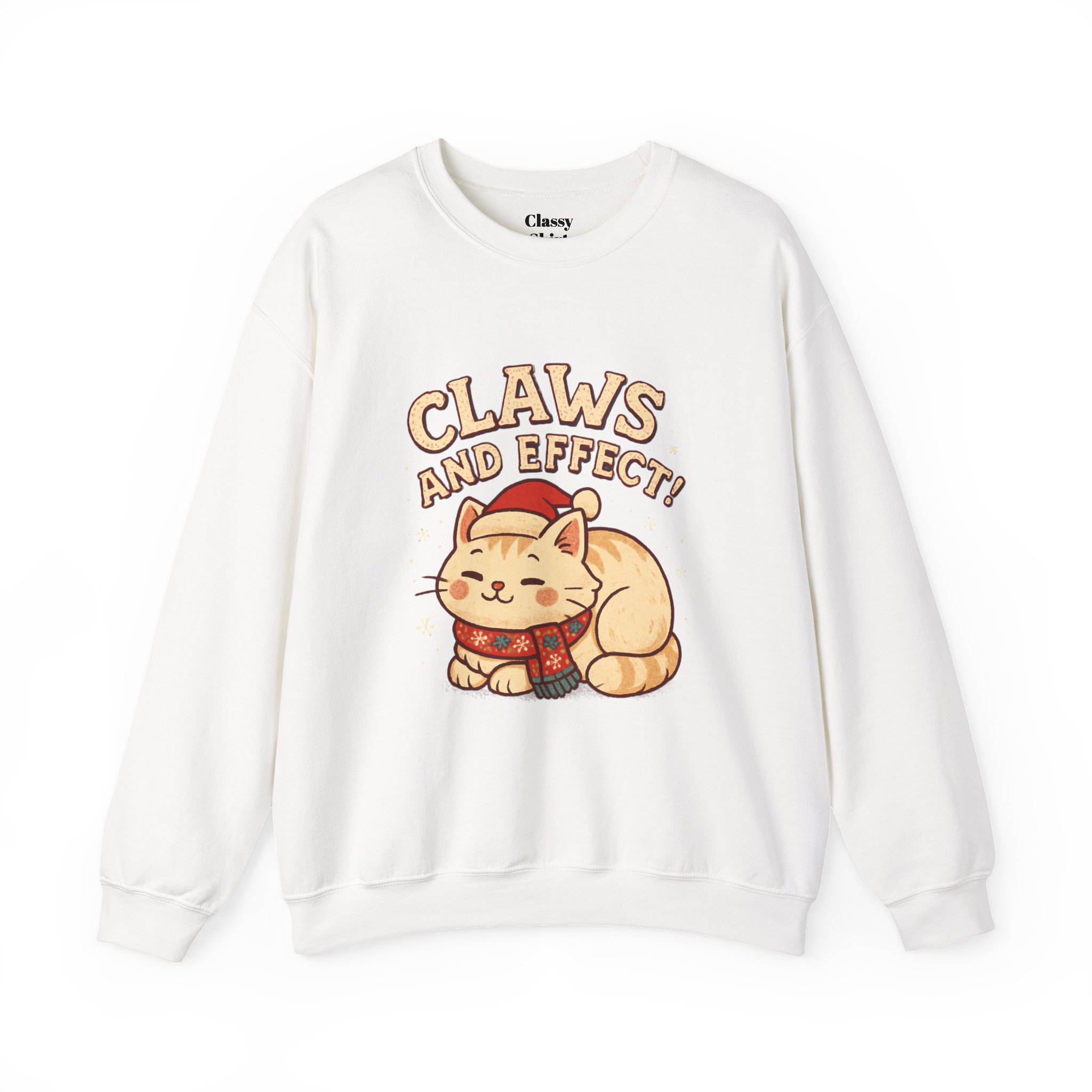 Soft, slightly oversized crewneck sweatshirt with a cozy, playful vibe. A warm cream base frames a charming embroidered-style illustration of a curled-up cat wearing a knit scarf and Santa hat, crowned by the cheeky slogan “Claws and Effect.” Lightweight enough for layering yet sturdy enough to hold shape, this sweatshirt feels lived-in from the first wear. It settles into weekend slow mornings, holiday movie nights, and casual strolls through twinkle-lit streets. The gentle palette and nostalgic illustration speak to quiet-knit wardrobes and those who collect small, meaningful moments—wear it to channel that warm, homey comfort and a wink of cat-adoring humor.