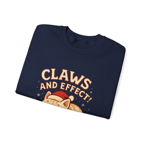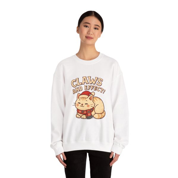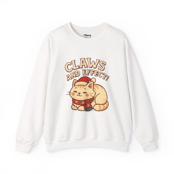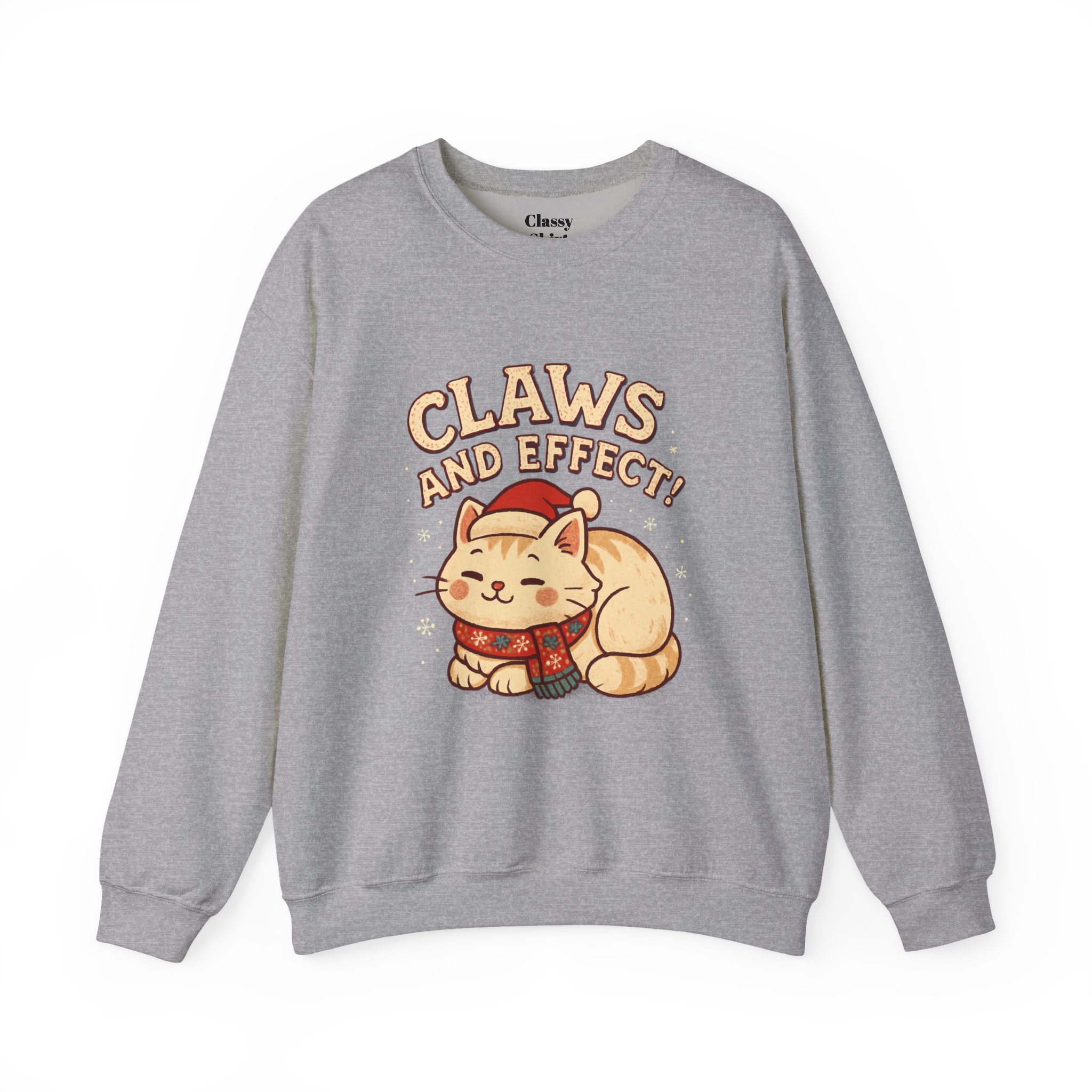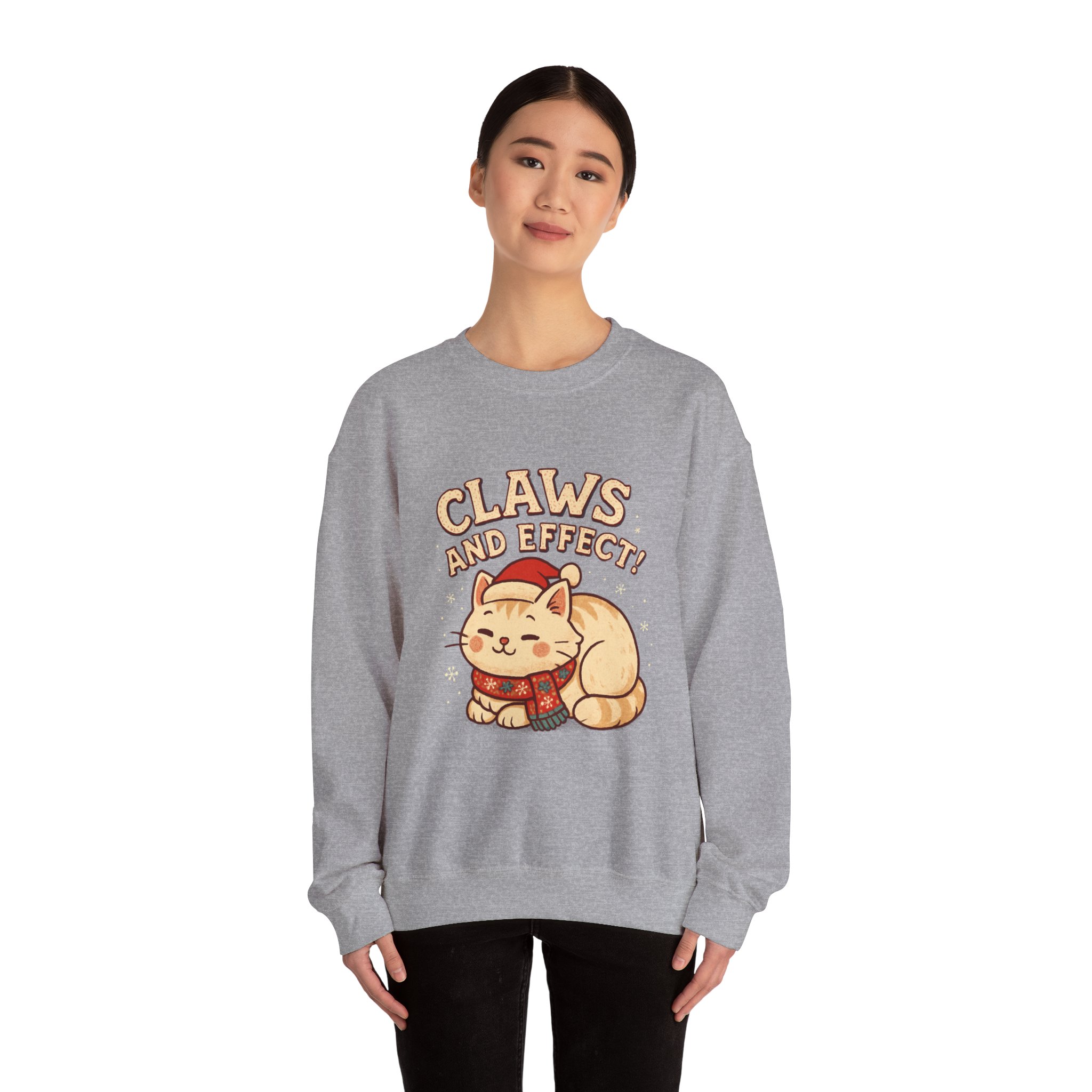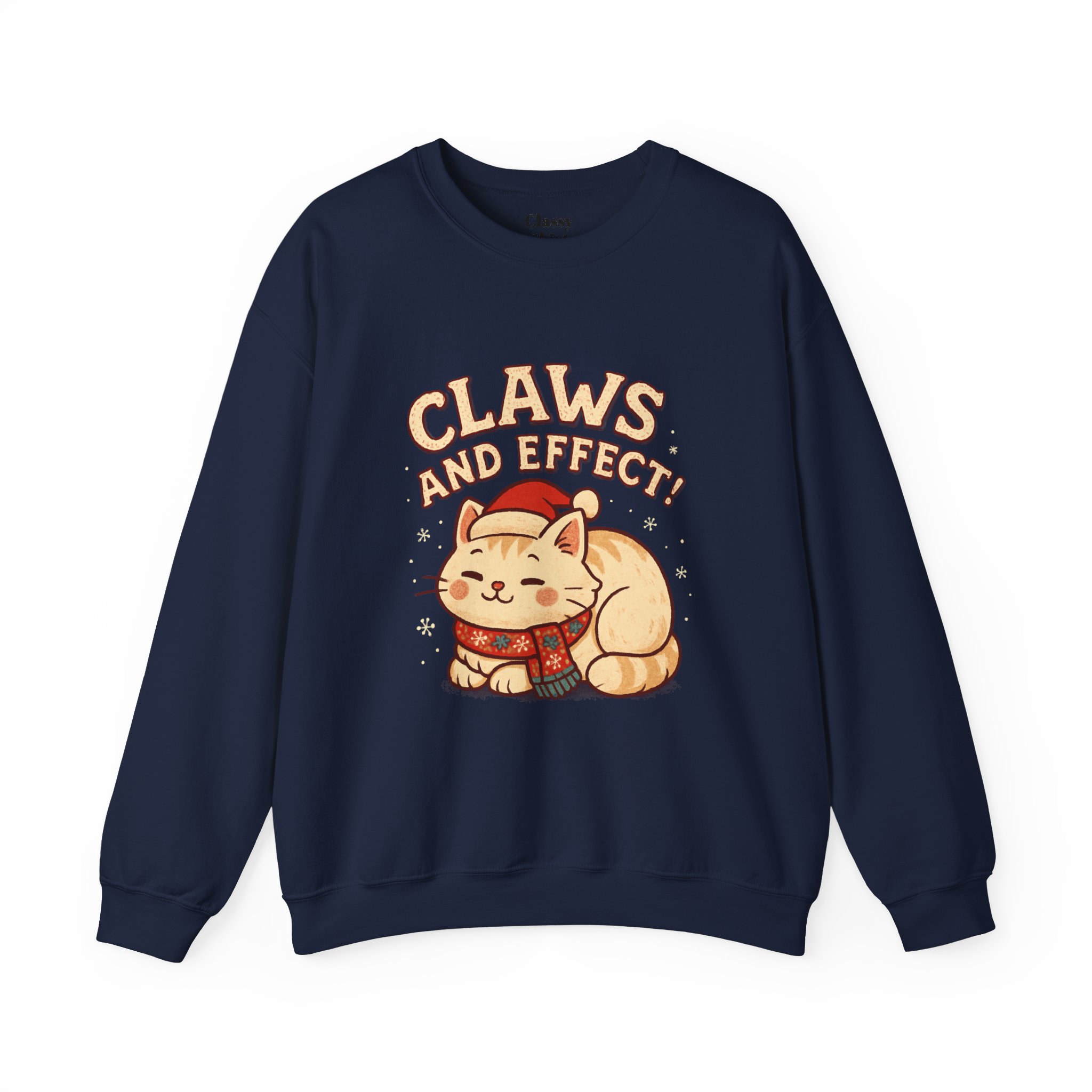 Soft, slightly oversized crewneck sweatshirt with a cozy, playful vibe. A warm cream base frames a charming embroidered-style illustration of a curled-up cat wearing a knit scarf and Santa hat, crowned by the cheeky slogan “Claws and Effect.” Lightweight enough for layering yet sturdy enough to hold shape, this sweatshirt feels lived-in from the first wear. It settles into weekend slow mornings, holiday movie nights, and casual strolls through twinkle-lit streets. The gentle palette and nostalgic illustration speak to quiet-knit wardrobes and those who collect small, meaningful moments—wear it to channel that warm, homey comfort and a wink of cat-adoring humor.