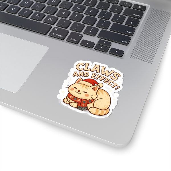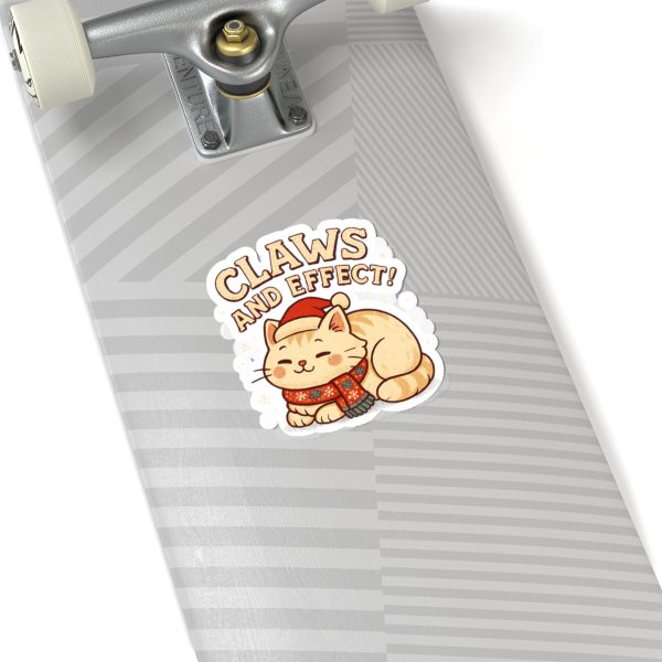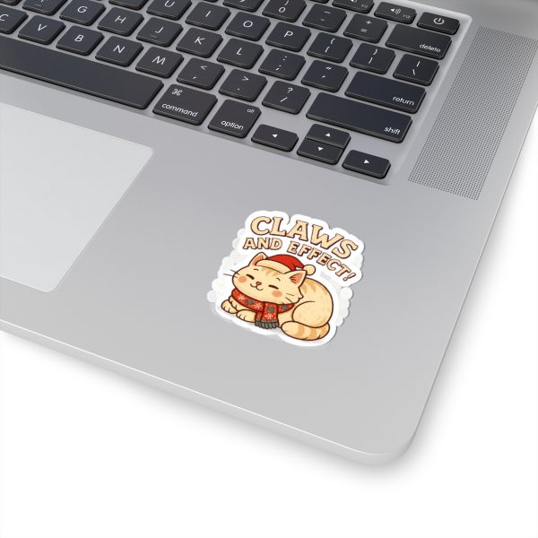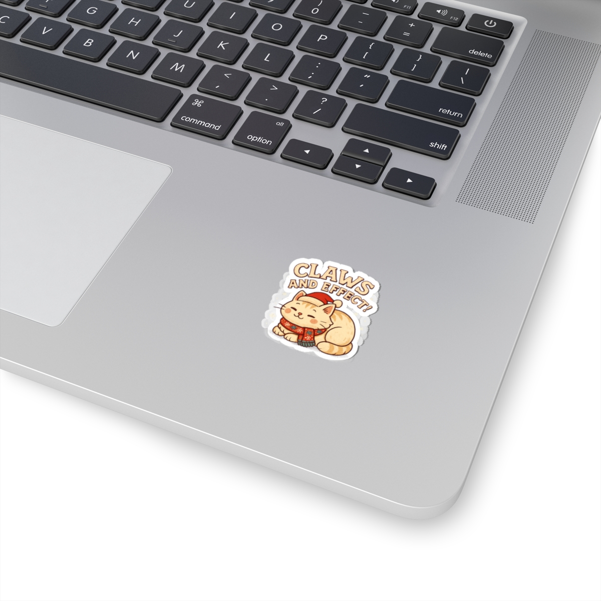 A warm, whimsical sticker that brings cozy charm to your things. This kiss-cut vinyl decal features a chubby, scarf-wearing cat with a mischievous smile and the playful phrase “CLAWS AND EFFECT!” in cheerful lettering. The glossy finish makes the colors pop while offering scratch resistance, and the clear cut around the art lets the design blend seamlessly on laptops, journals, water bottles, or window panes. It’s an easy way to add personality — a tiny snapshot of comfort and feline sass that brightens everyday gear.