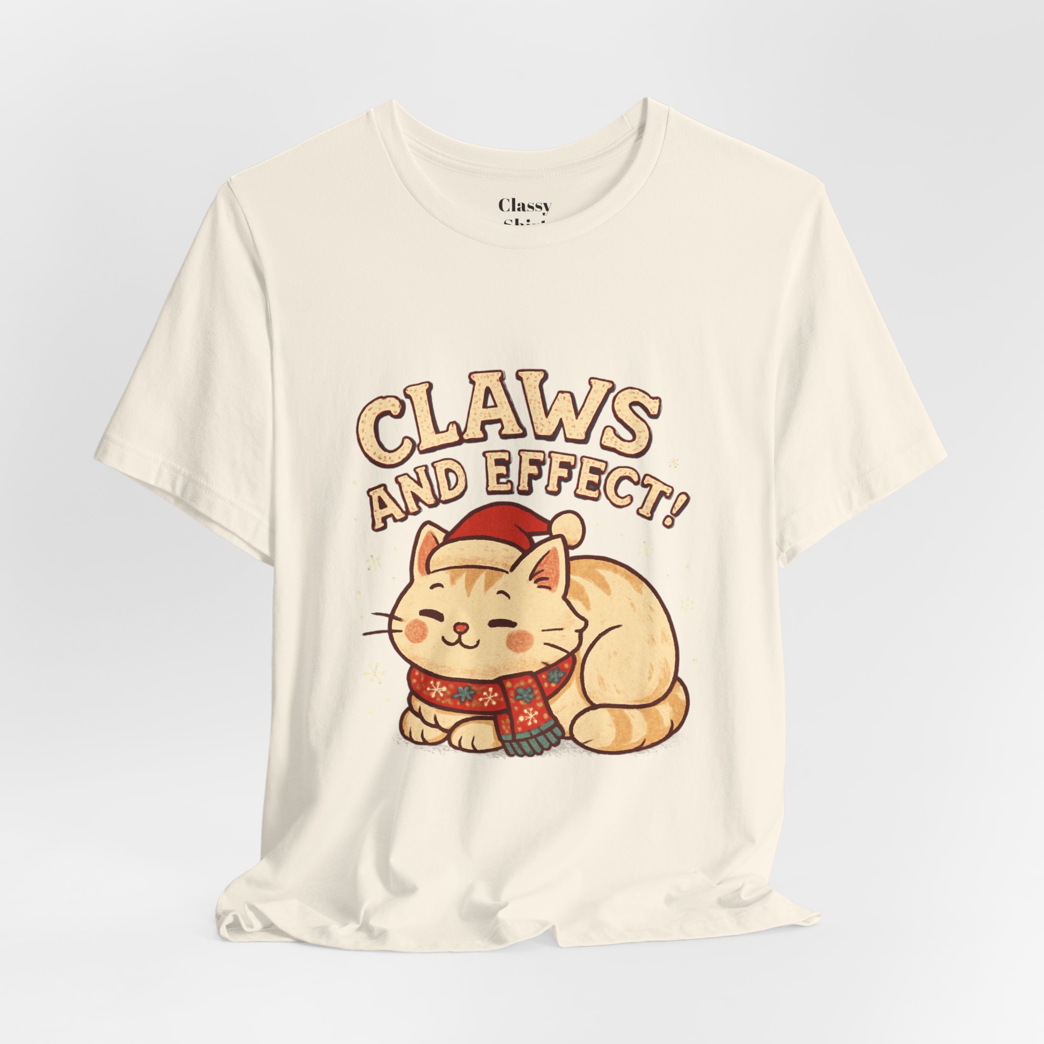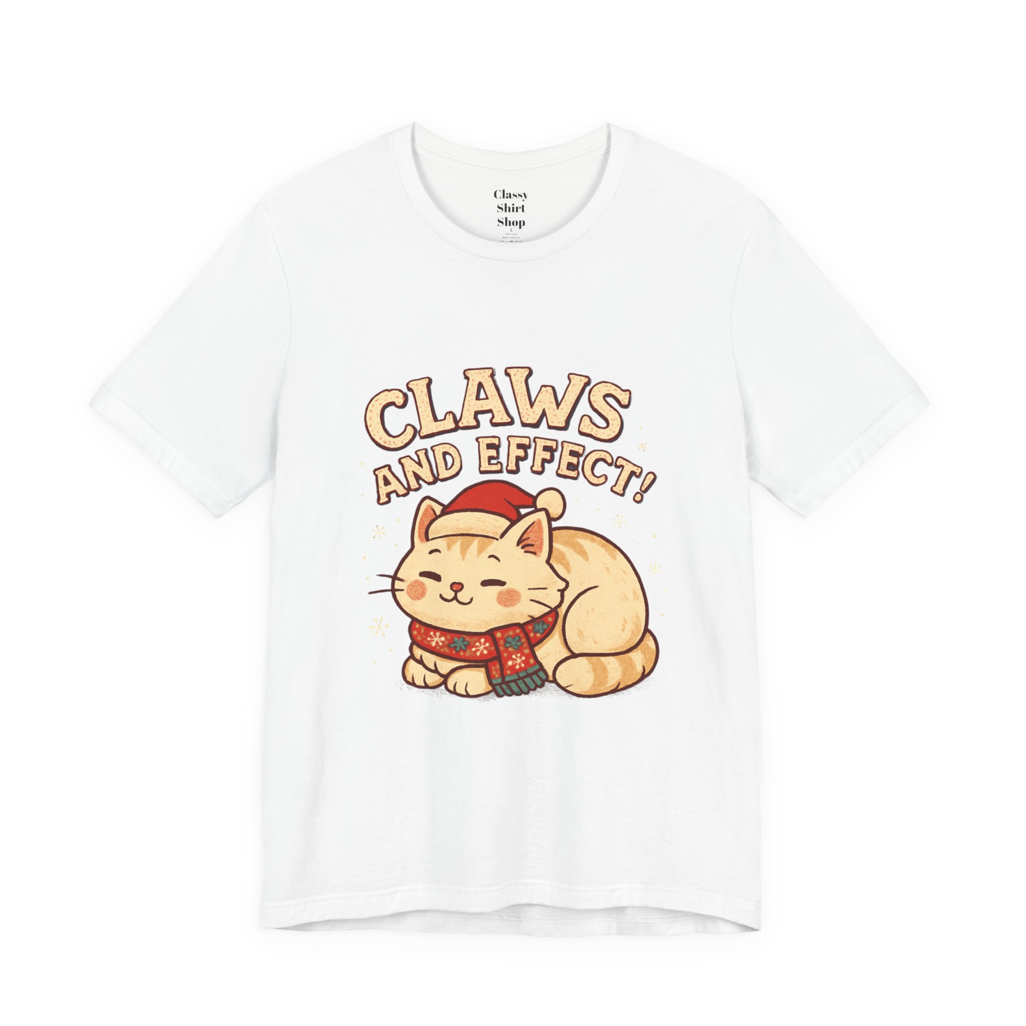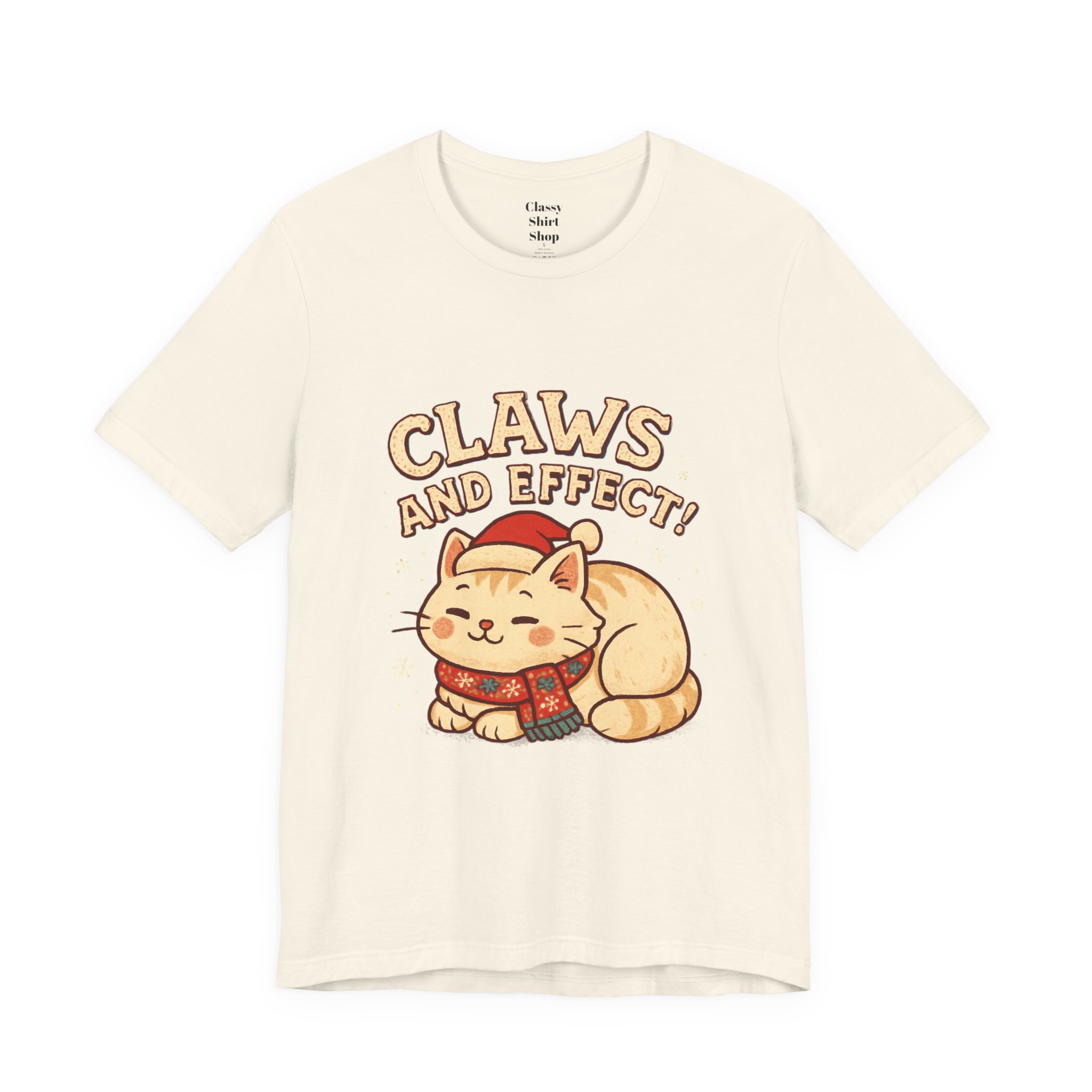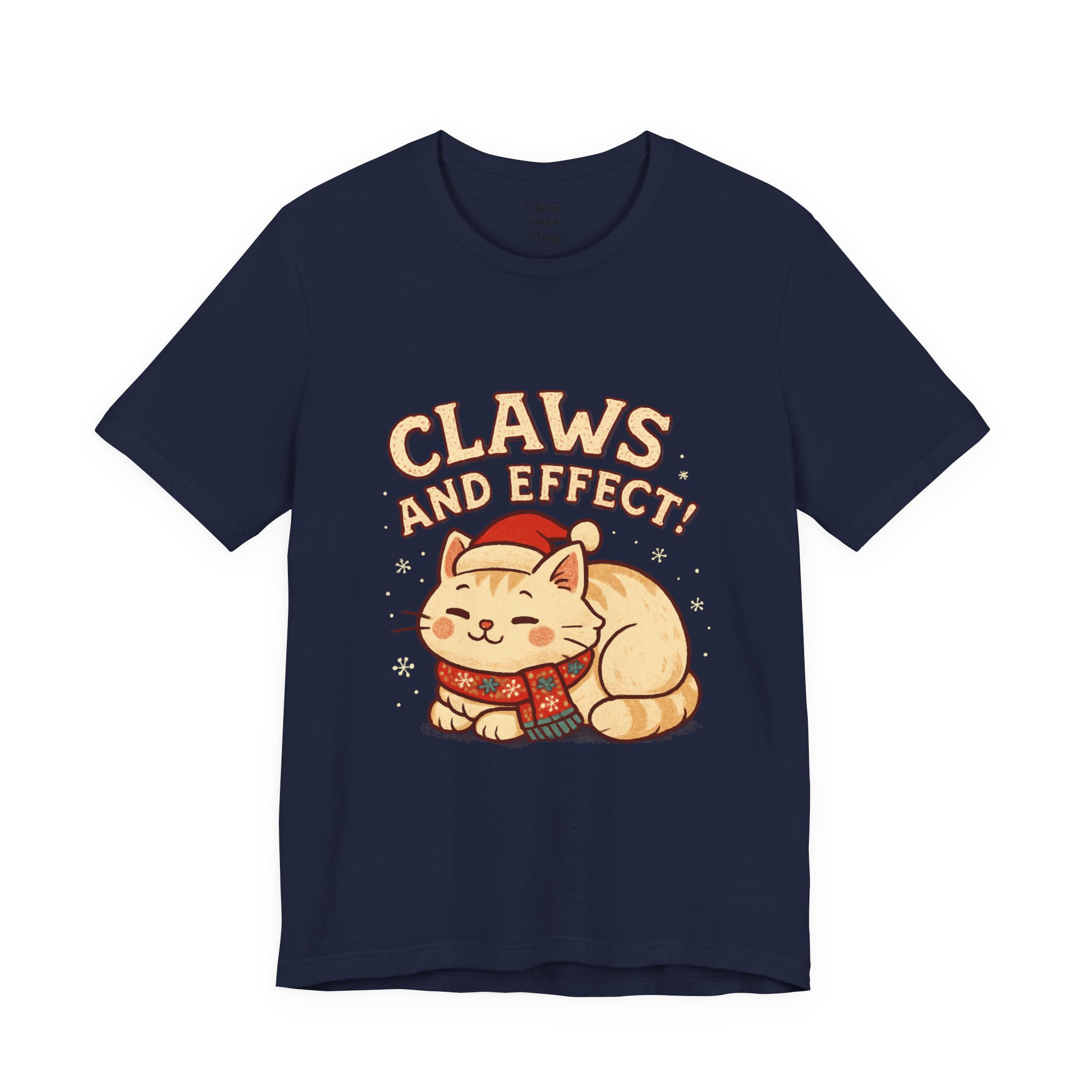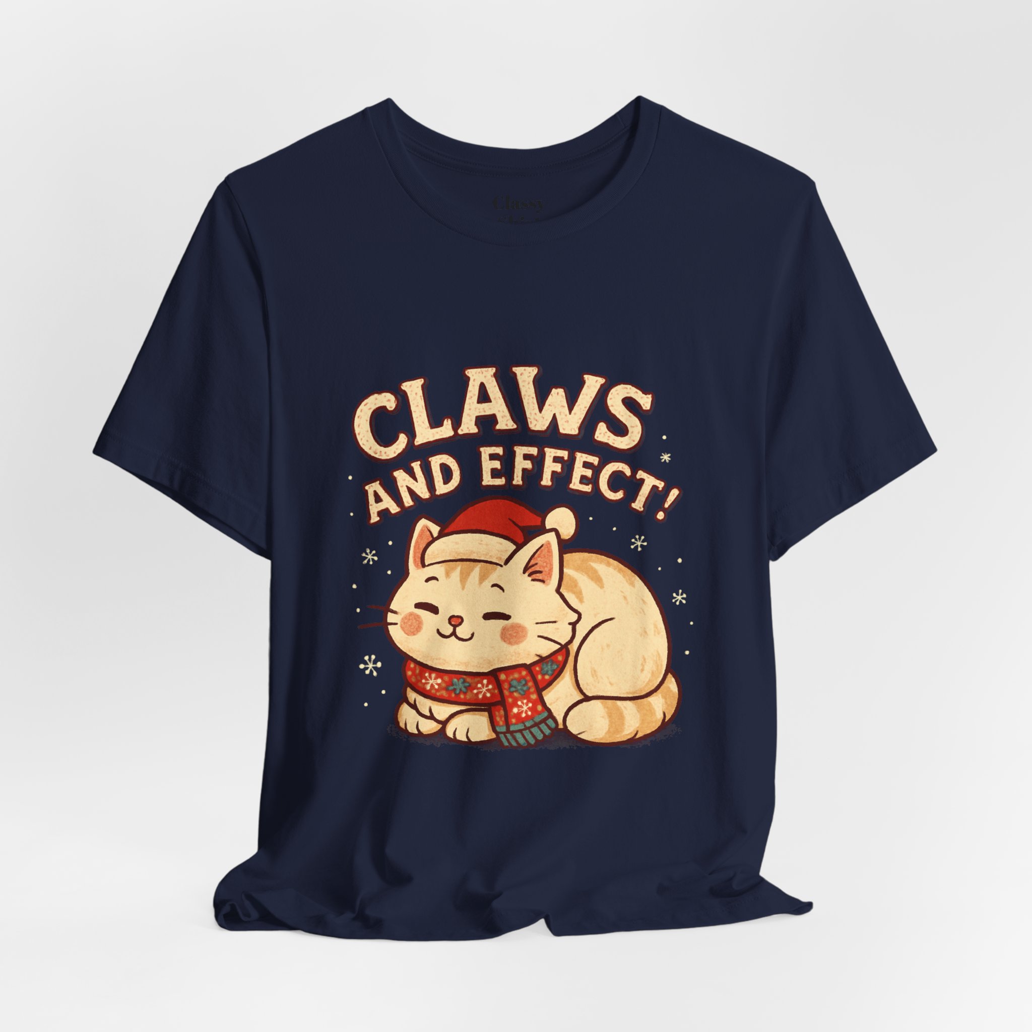 Curl up with a cozy vibe and a wink of humor. This lightweight jersey tee features a warm, illustrated tabby wearing a knit hat and scarf beneath the playful phrase “Claws and Effect.” Soft to the touch and breathable, it layers easily under jackets or stands alone on cool mornings. It’s the kind of shirt you reach for when you want to feel comfortable, a little silly, and quietly festive — whether you’re sipping tea at home, wandering holiday markets, or sharing laughs with friends at a casual get-together.