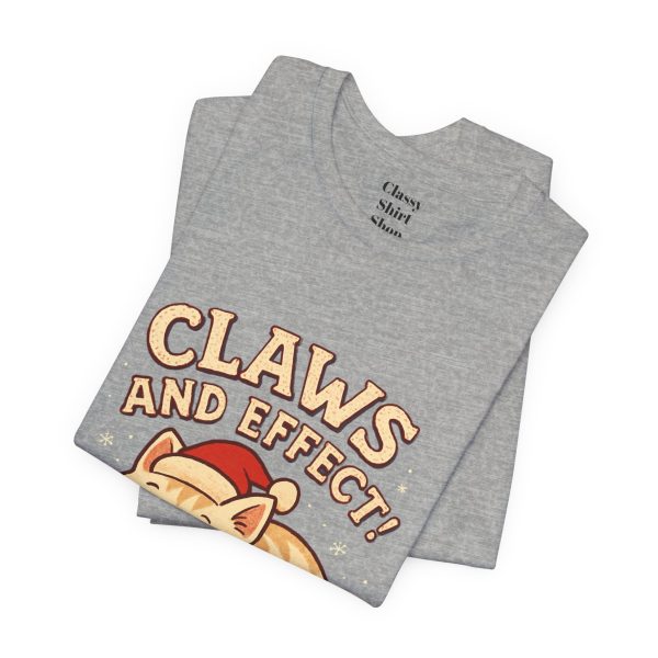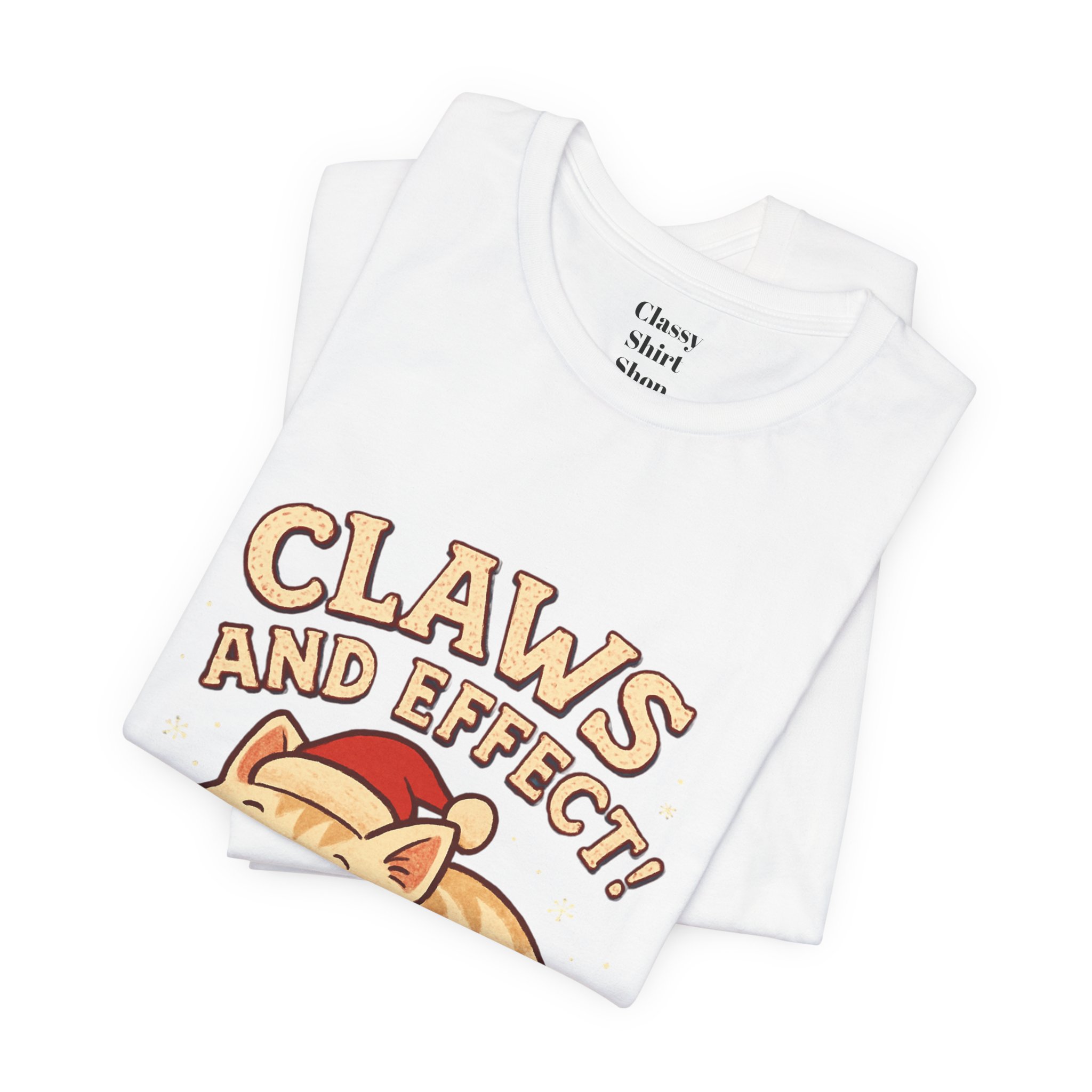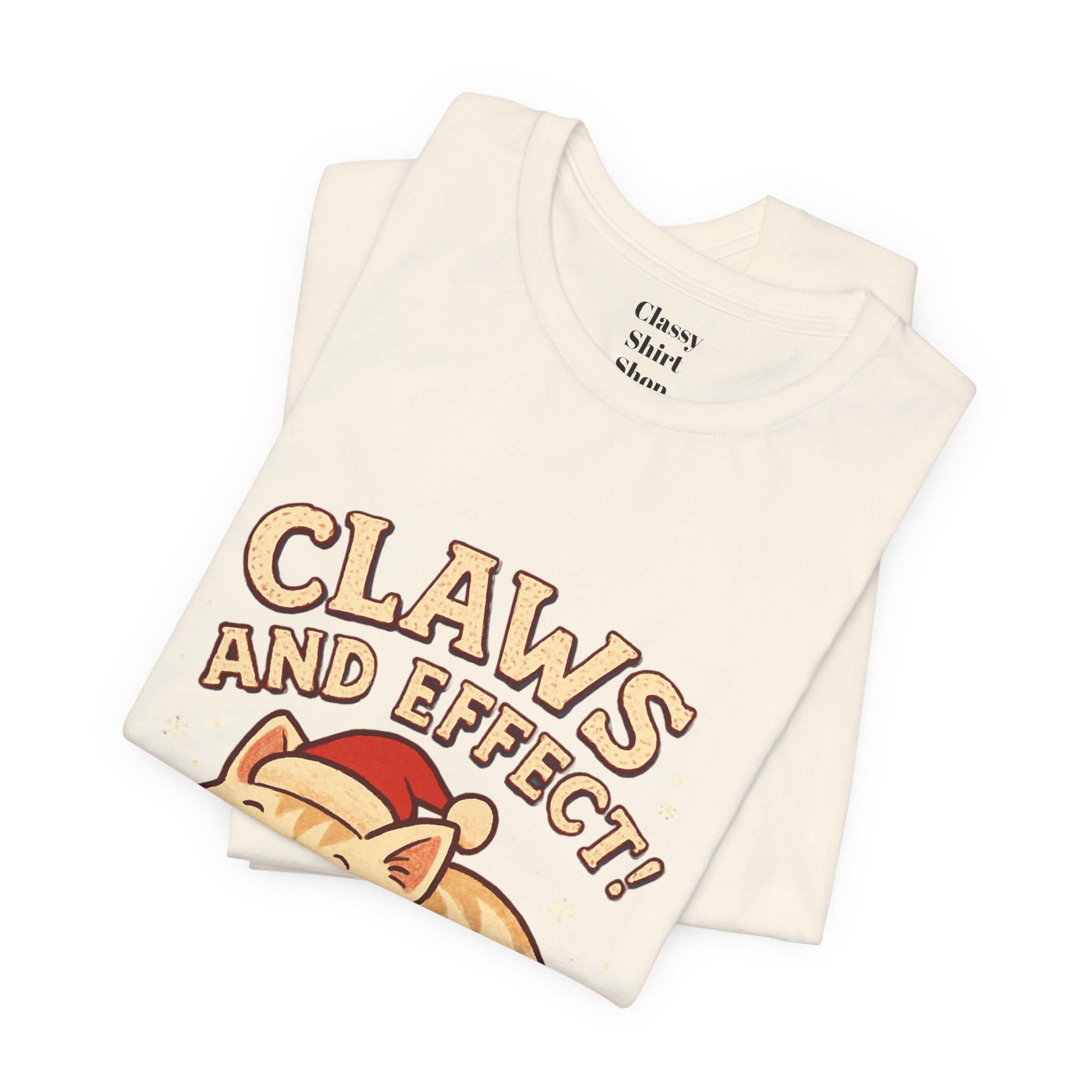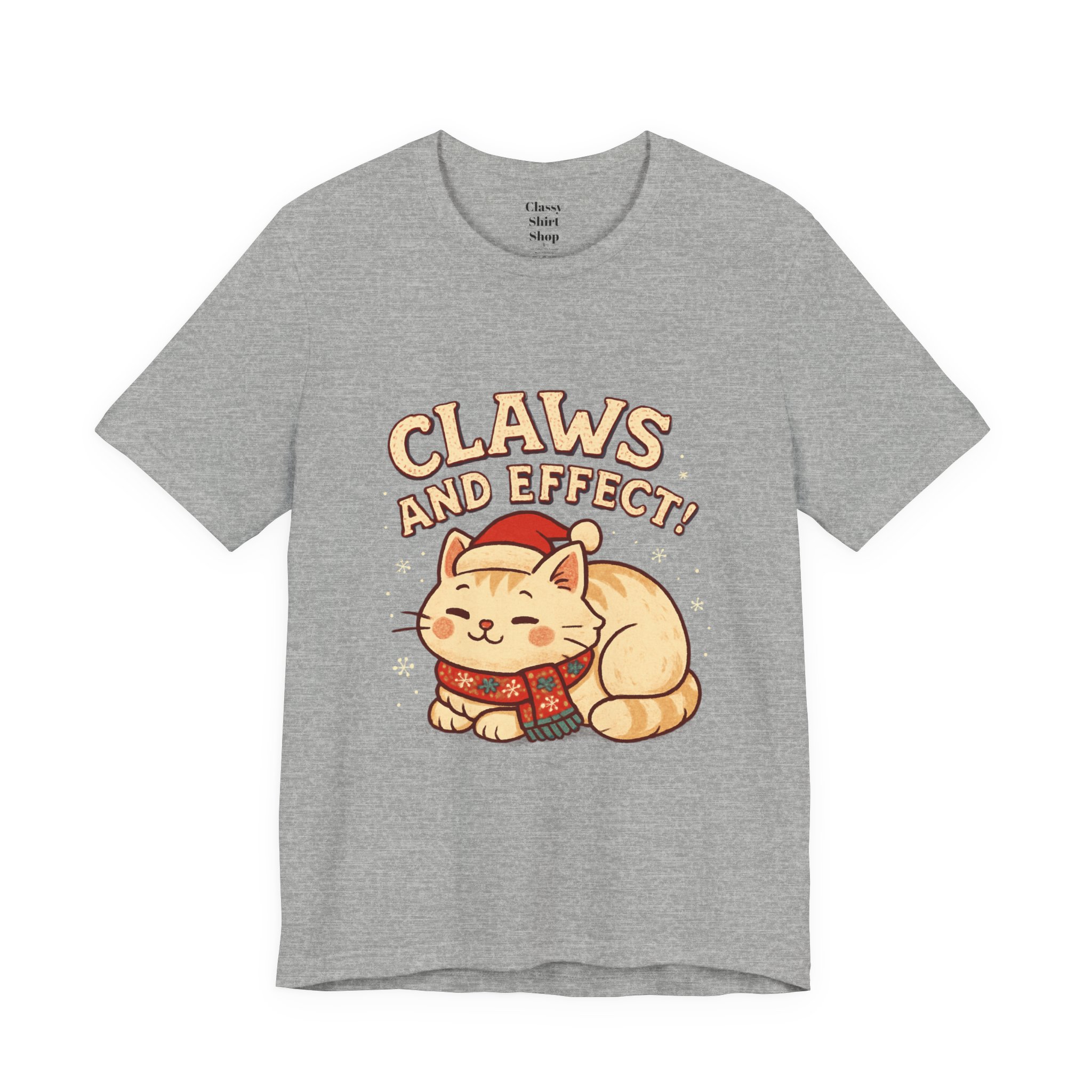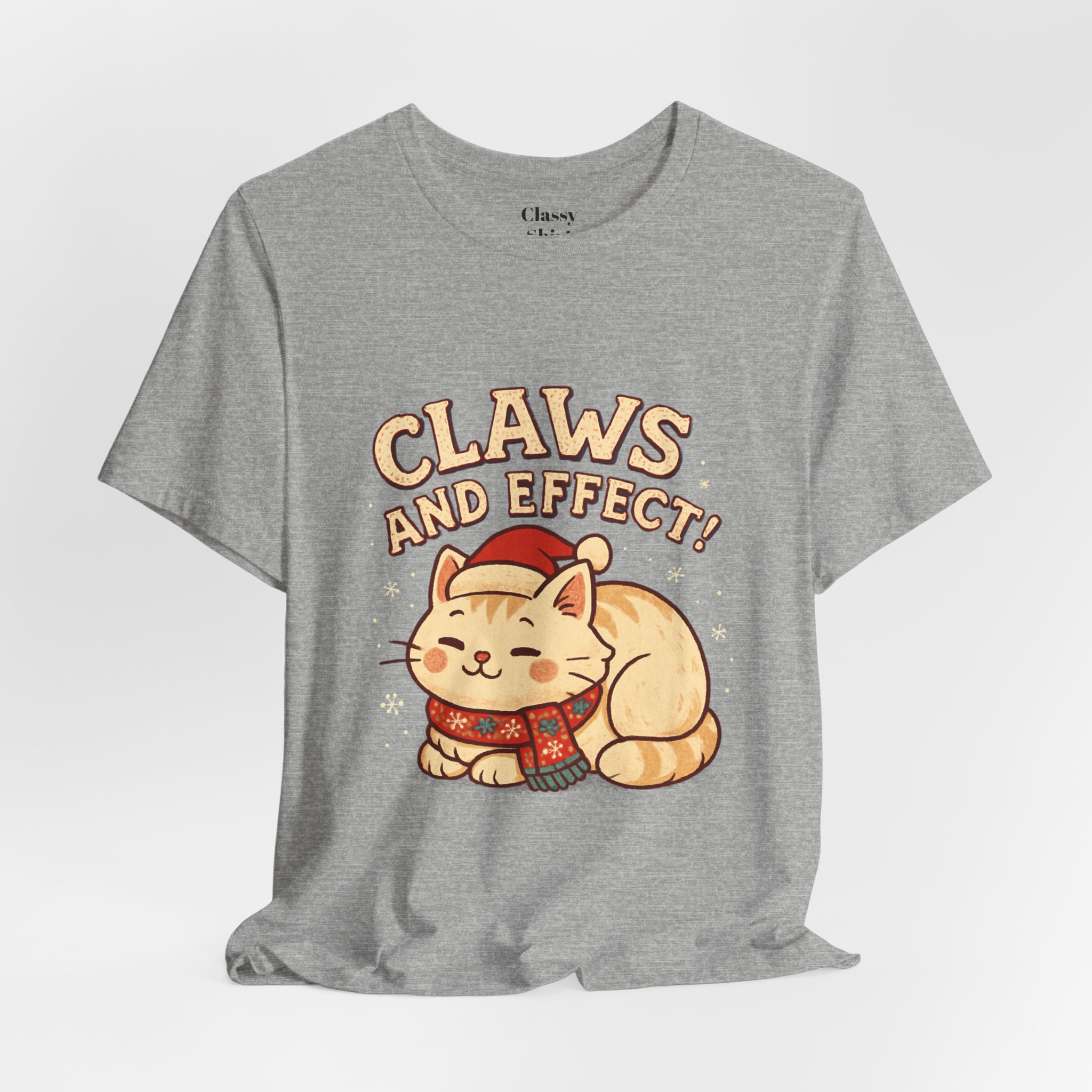 Curl up with a cozy vibe and a wink of humor. This lightweight jersey tee features a warm, illustrated tabby wearing a knit hat and scarf beneath the playful phrase “Claws and Effect.” Soft to the touch and breathable, it layers easily under jackets or stands alone on cool mornings. It’s the kind of shirt you reach for when you want to feel comfortable, a little silly, and quietly festive — whether you’re sipping tea at home, wandering holiday markets, or sharing laughs with friends at a casual get-together.