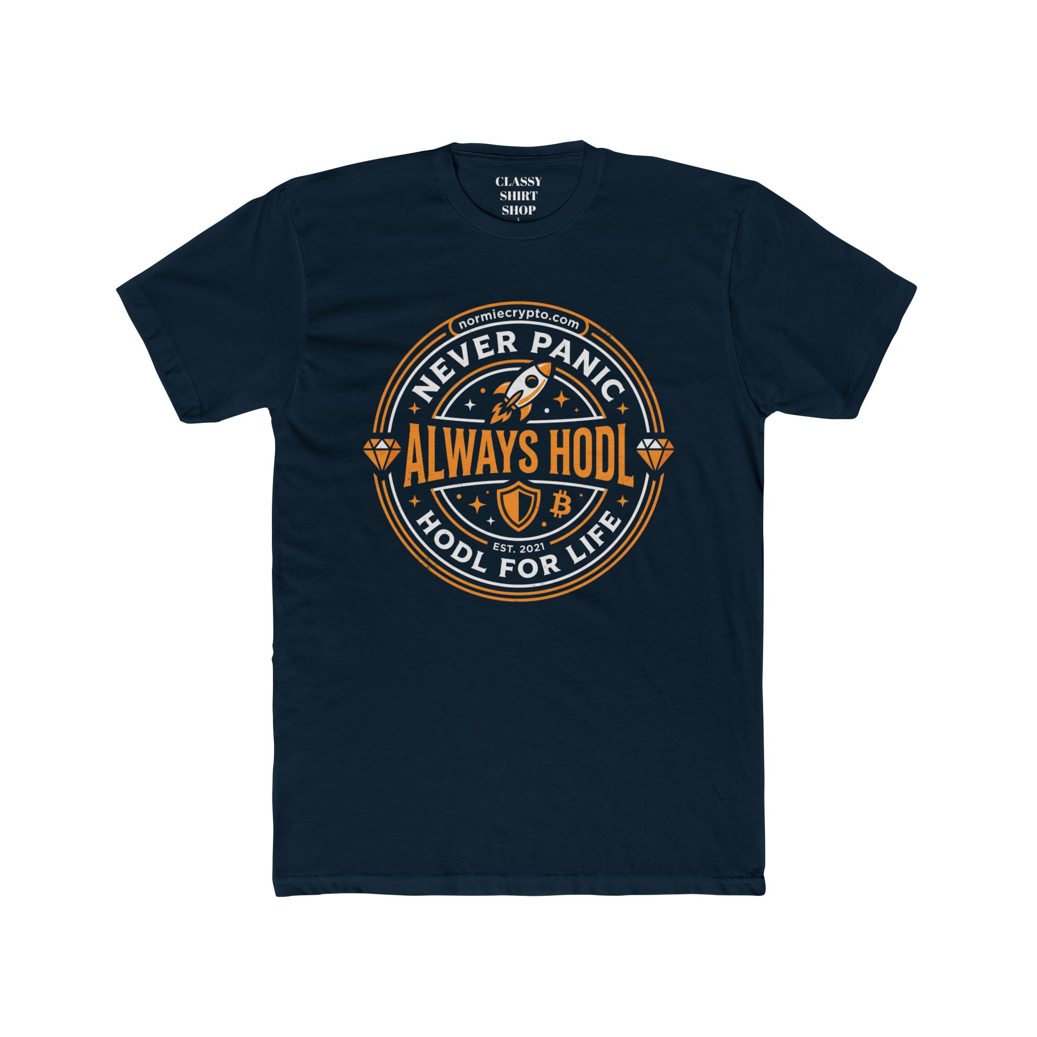 Be the first to review “Crypto T‑Shirt — “Never Panic Always HODL” Bitcoin Rocket Tee”