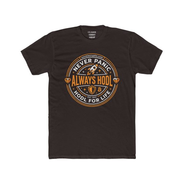 A lightweight cotton crew tee that wears like a trusted companion on blockchain meetups, late-night trading sessions, and everyday hangouts. The vintage-inspired circular graphic reads “Never Panic — Always HODL” with a rocket motif and subtle coin icons, giving it an authentic crypto-club vibe. The soft, breathable fabric and classic crew neckline let you layer or stand alone while the ribbed collar and shoulder tape keep the shape wash after wash. It sits comfortably through long commutes, crowded conferences, and casual coffee runs — the kind of shirt you reach for when you want to quietly signal you know the game and are in it for the long haul.