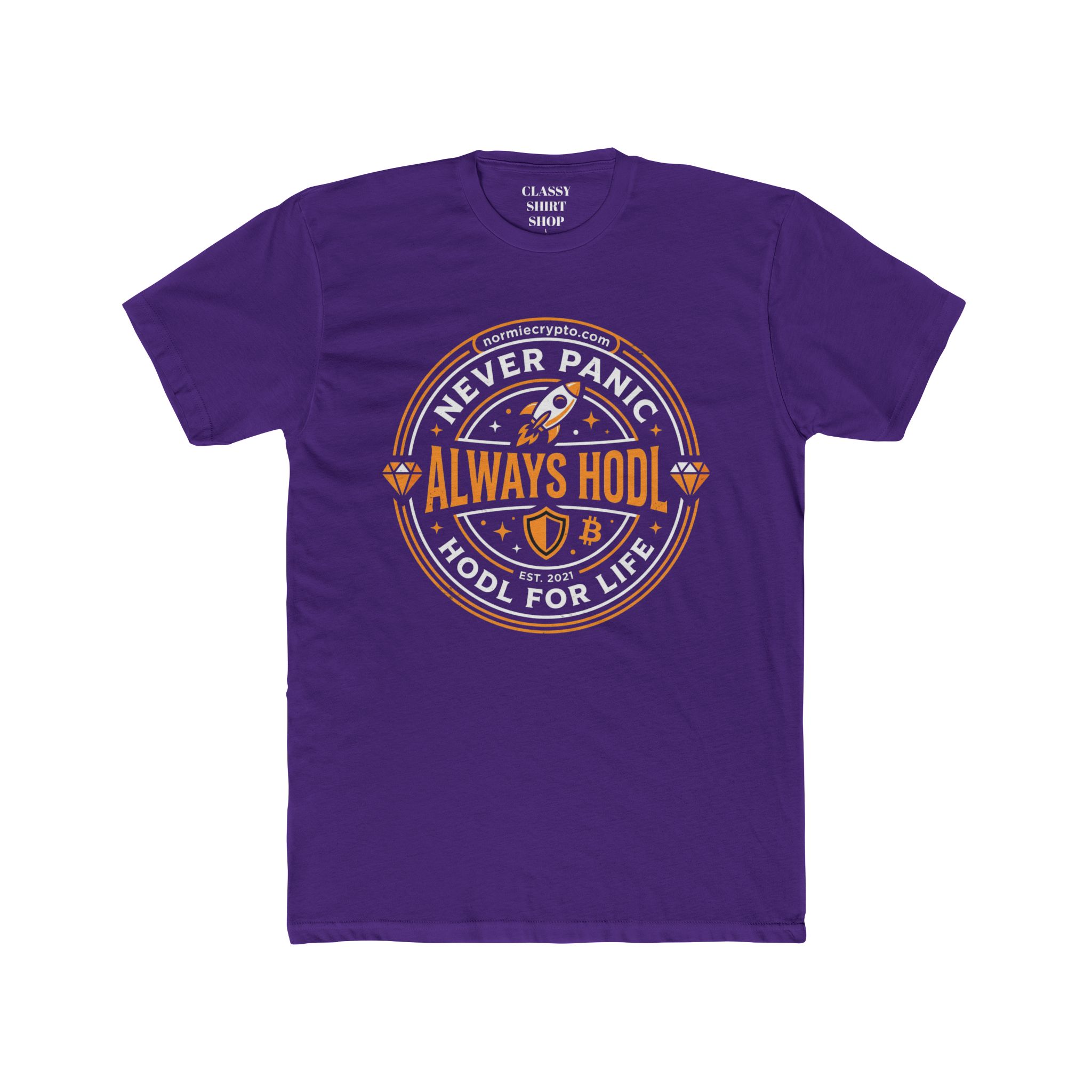 Crypto T‑Shirt — “Never Panic Always HODL” Bitcoin Rocket Tee