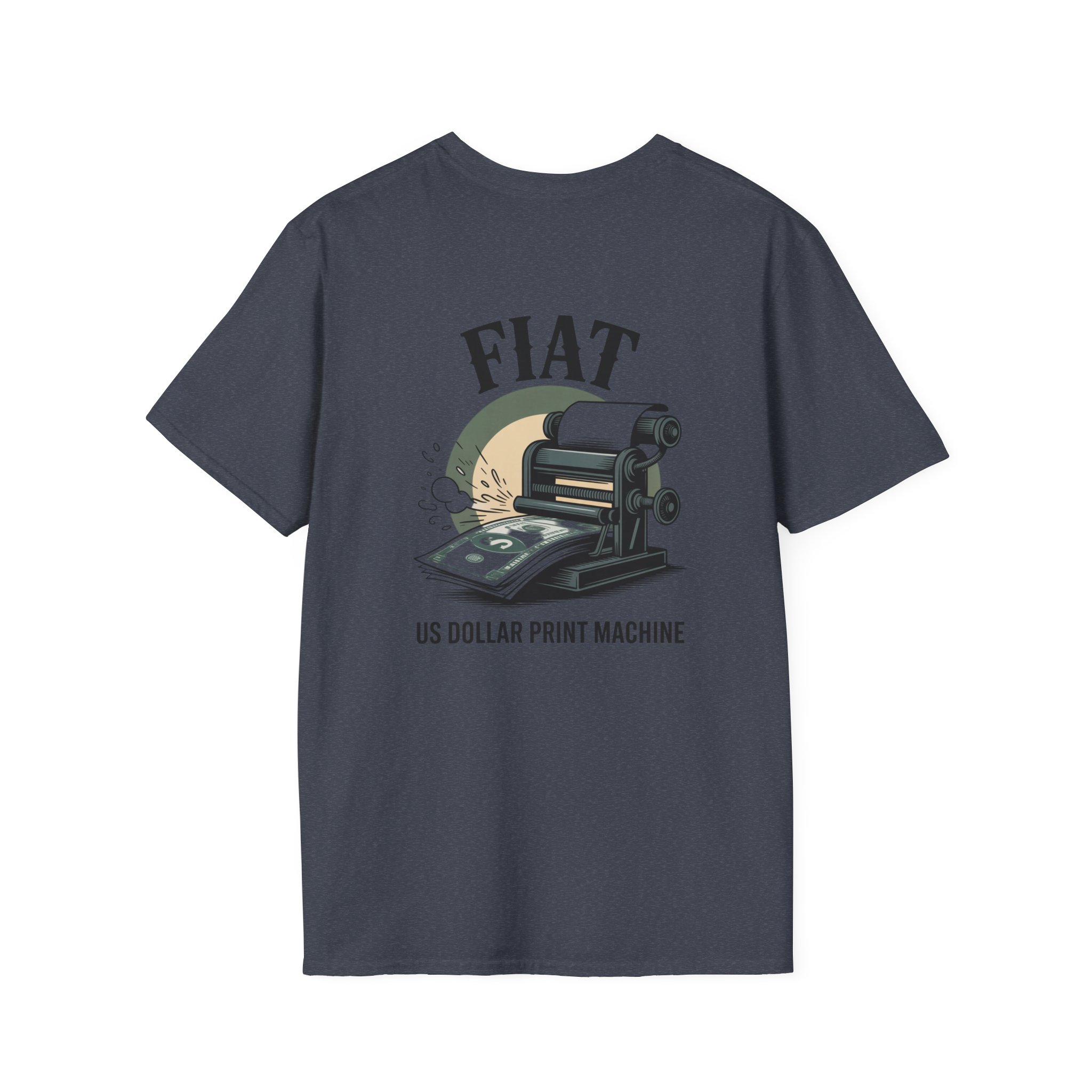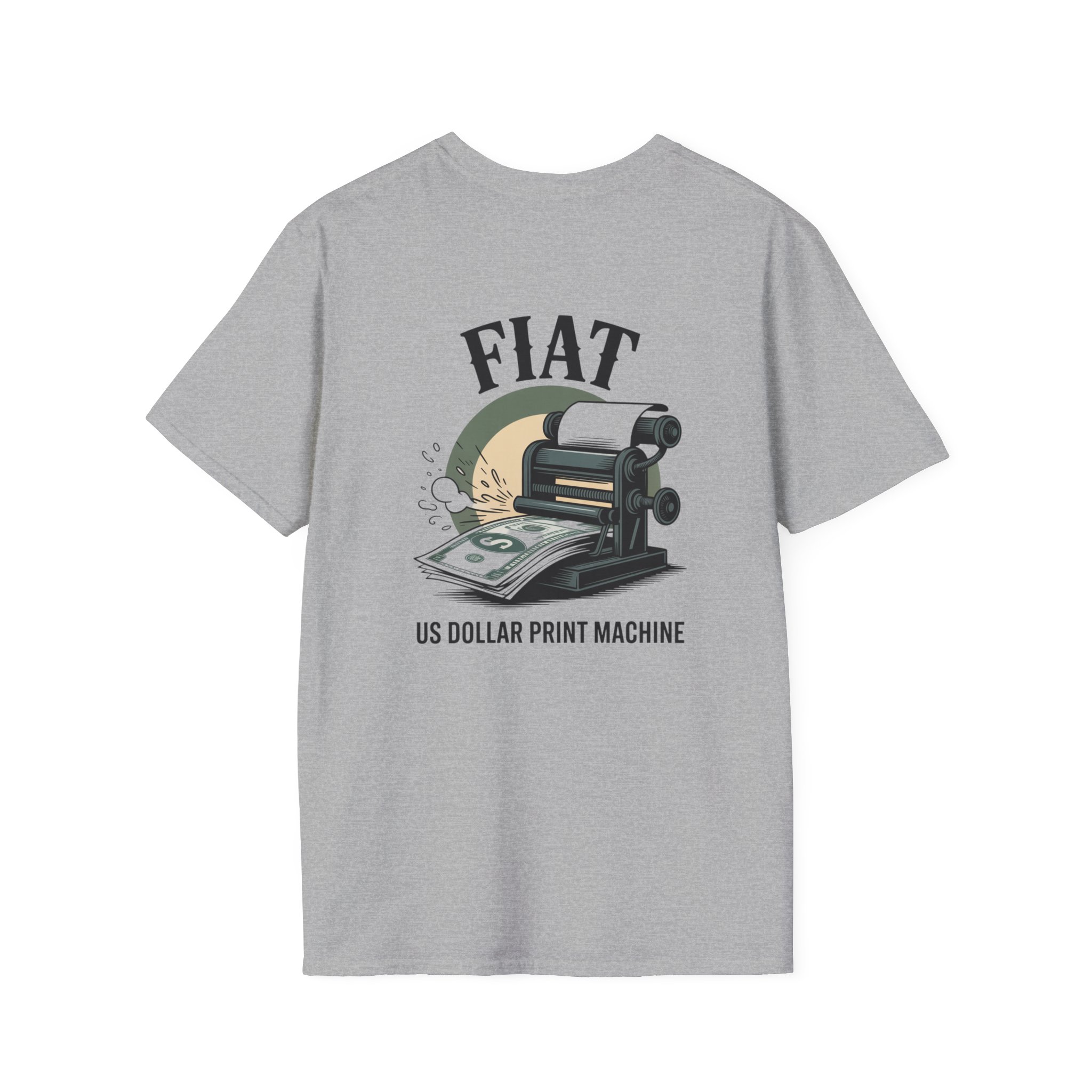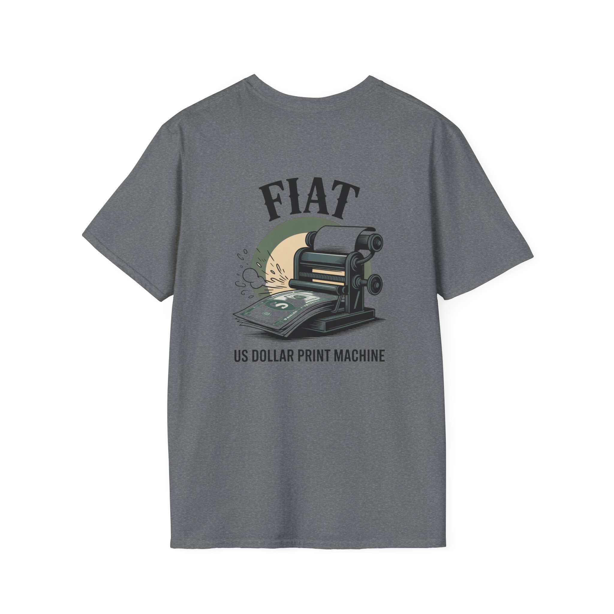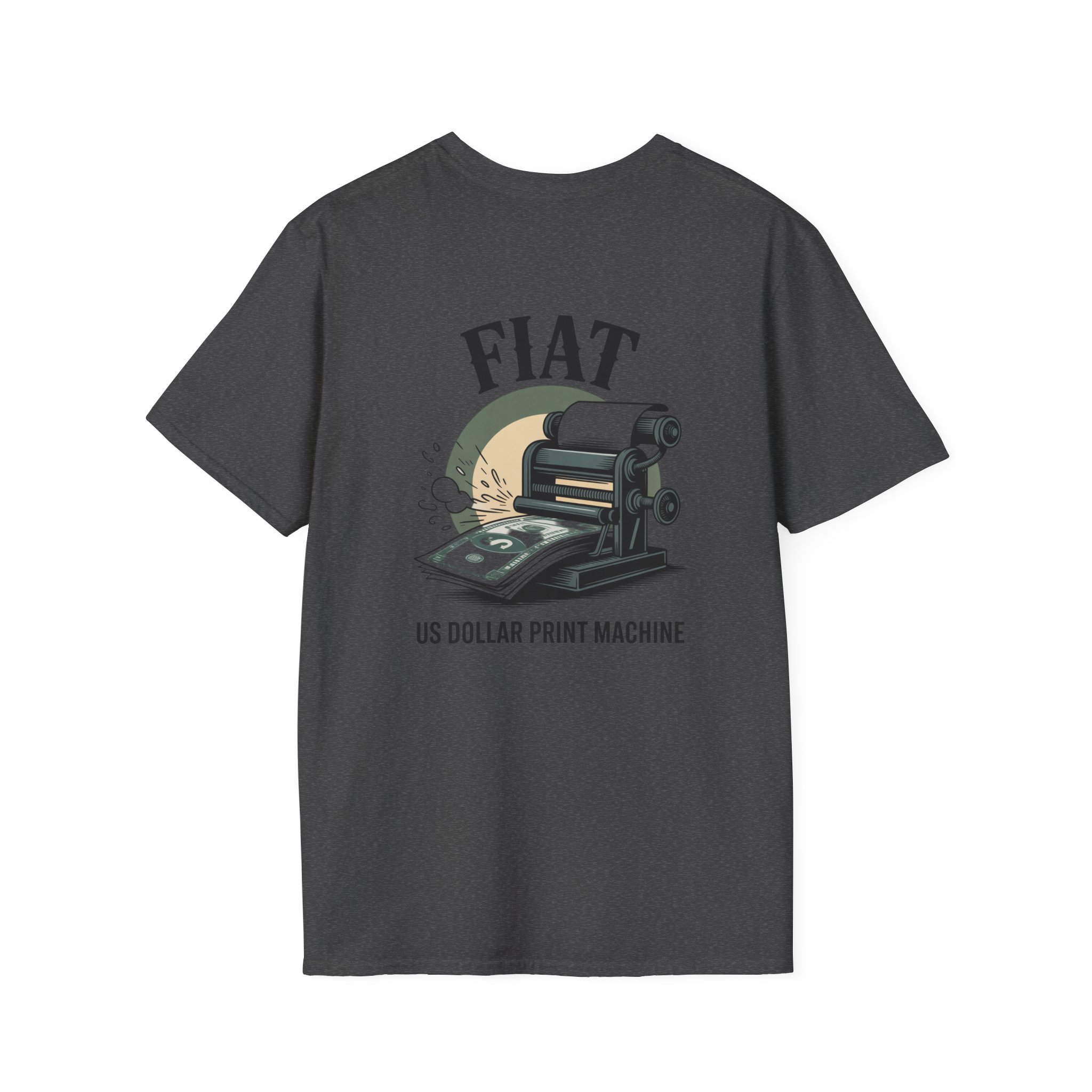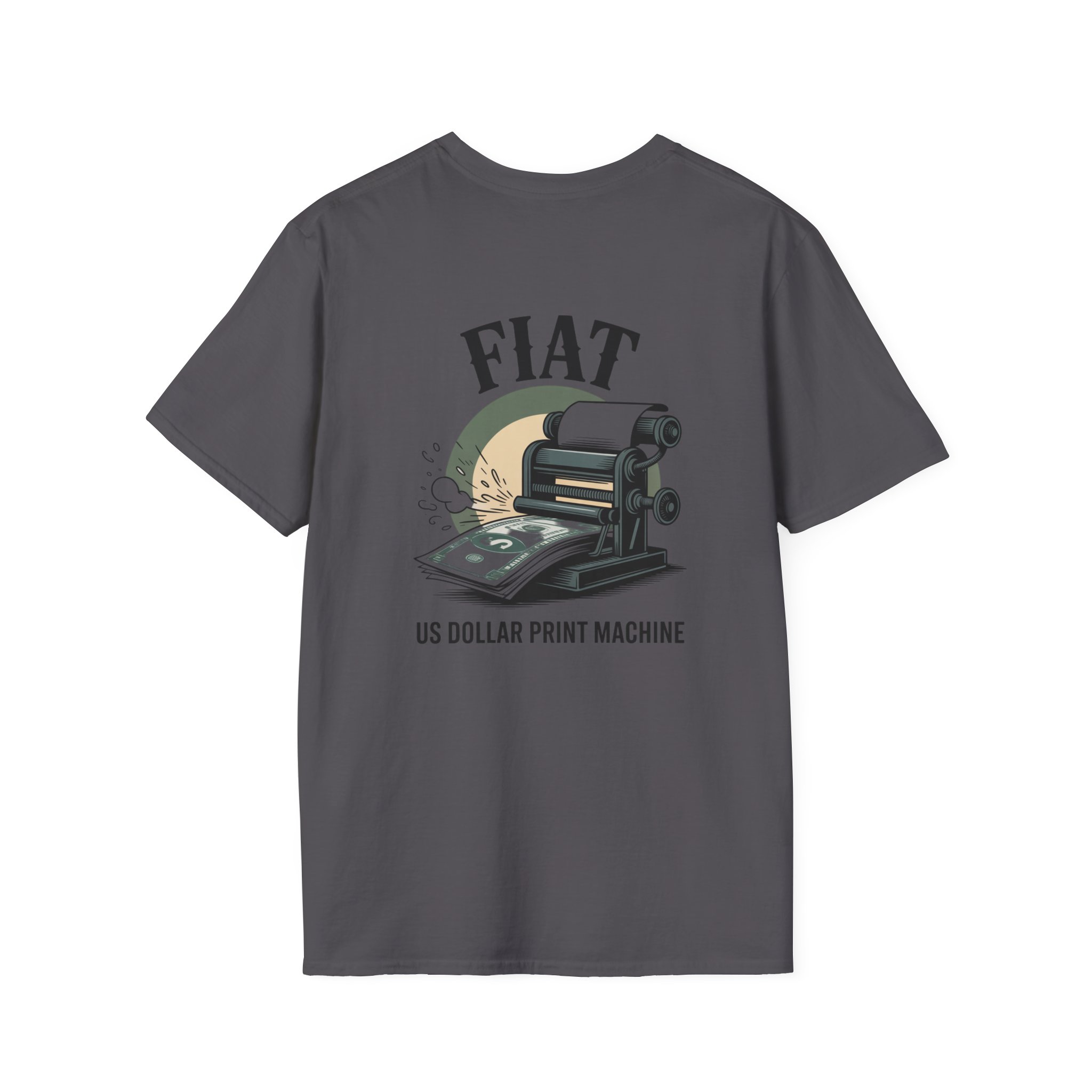 Lightweight, clean-cut tee with a retro, rebellious graphic that nods to monetary satire. The front chest carries a small emblem while the back shows a bold vintage printing press spitting out dollar bills under the headline “FIAT.” It wears like an everyday staple — soft, breathable ring-spun cotton that settles smooth against the skin and carries prints with crisp detail. The subtle natural texture in unprocessed shades adds character, and the ribbed crew neck and shoulder taping keep the silhouette steady after washes. Wear it to spark conversation, lean into political or economic humor, or layer it under a jacket for an effortless street-ready look.
