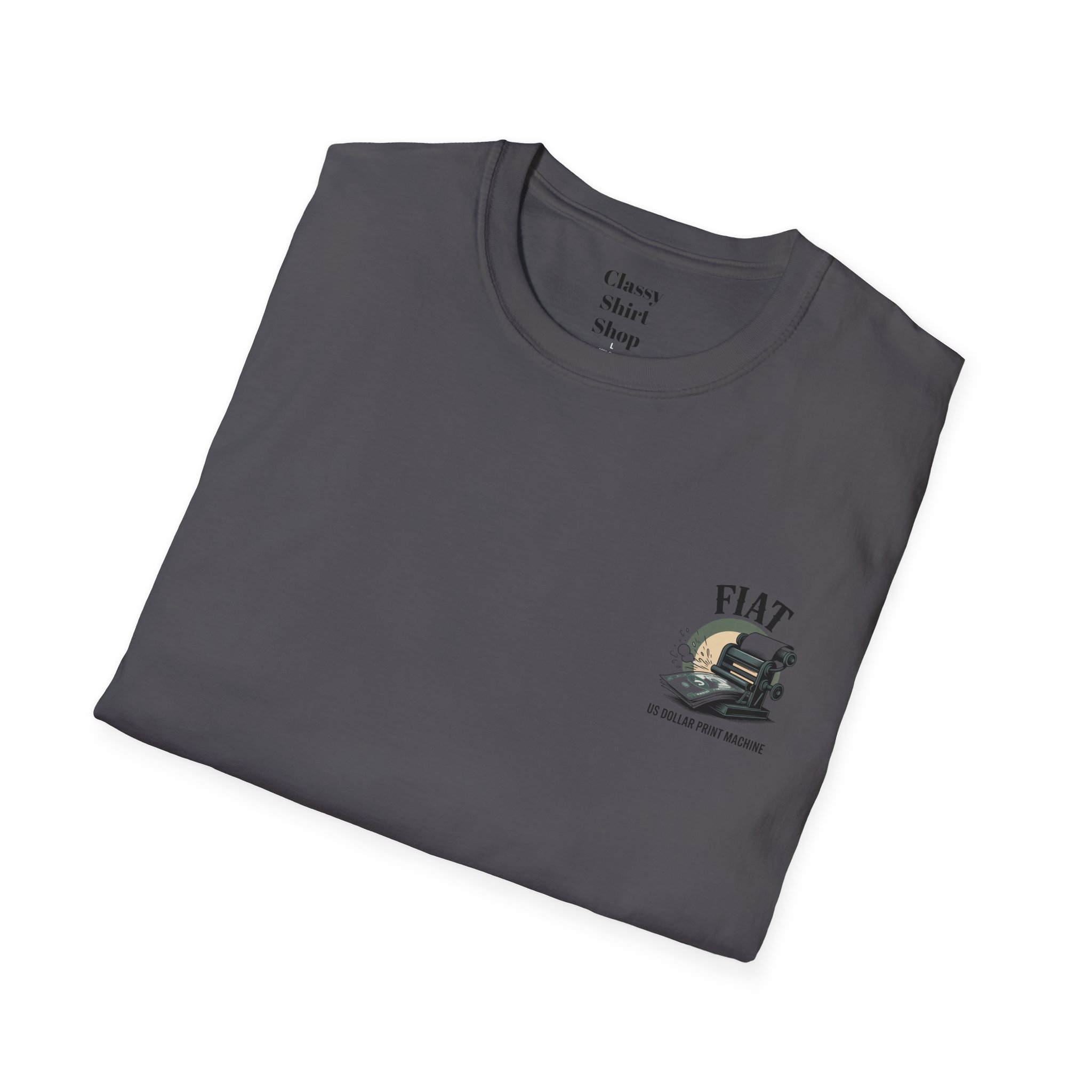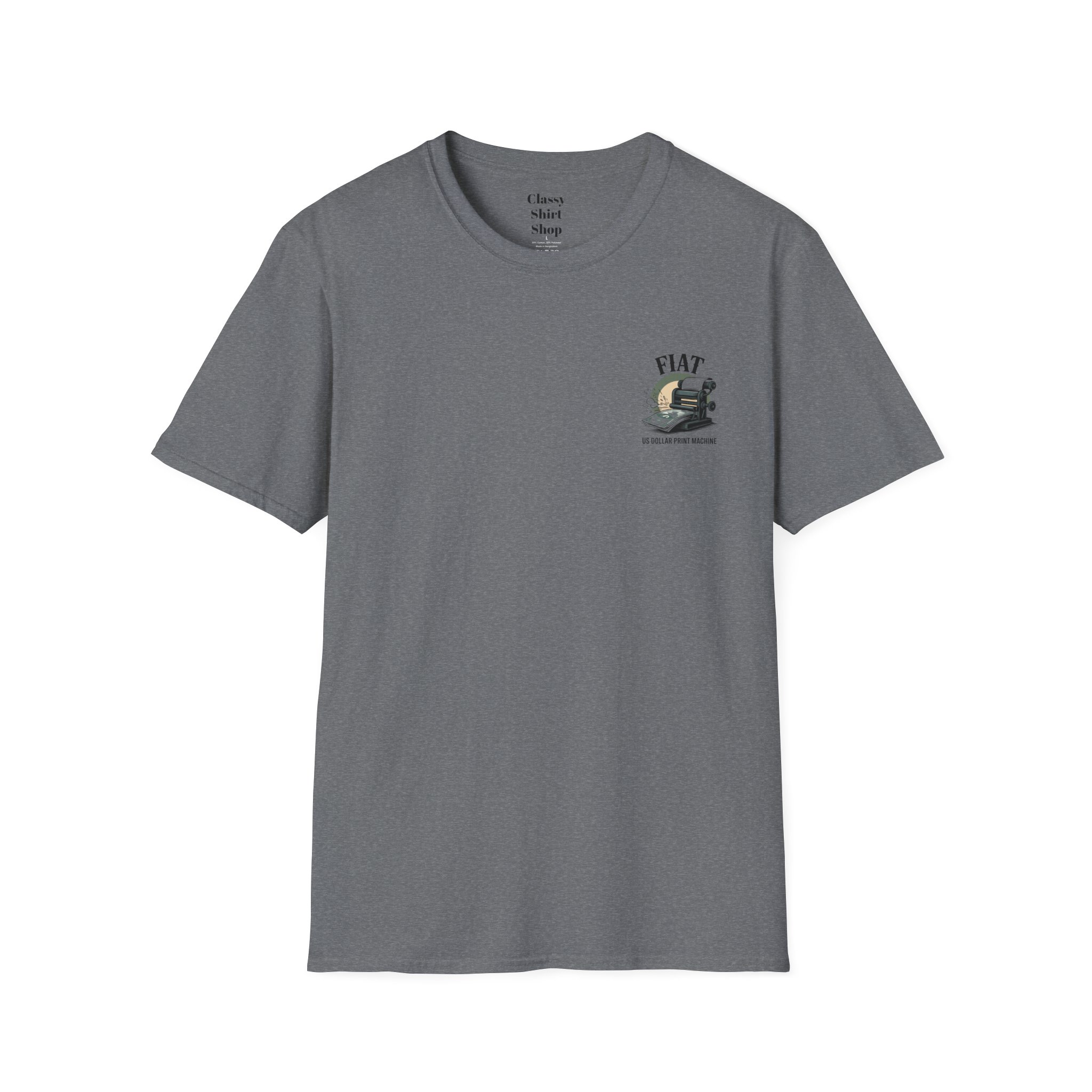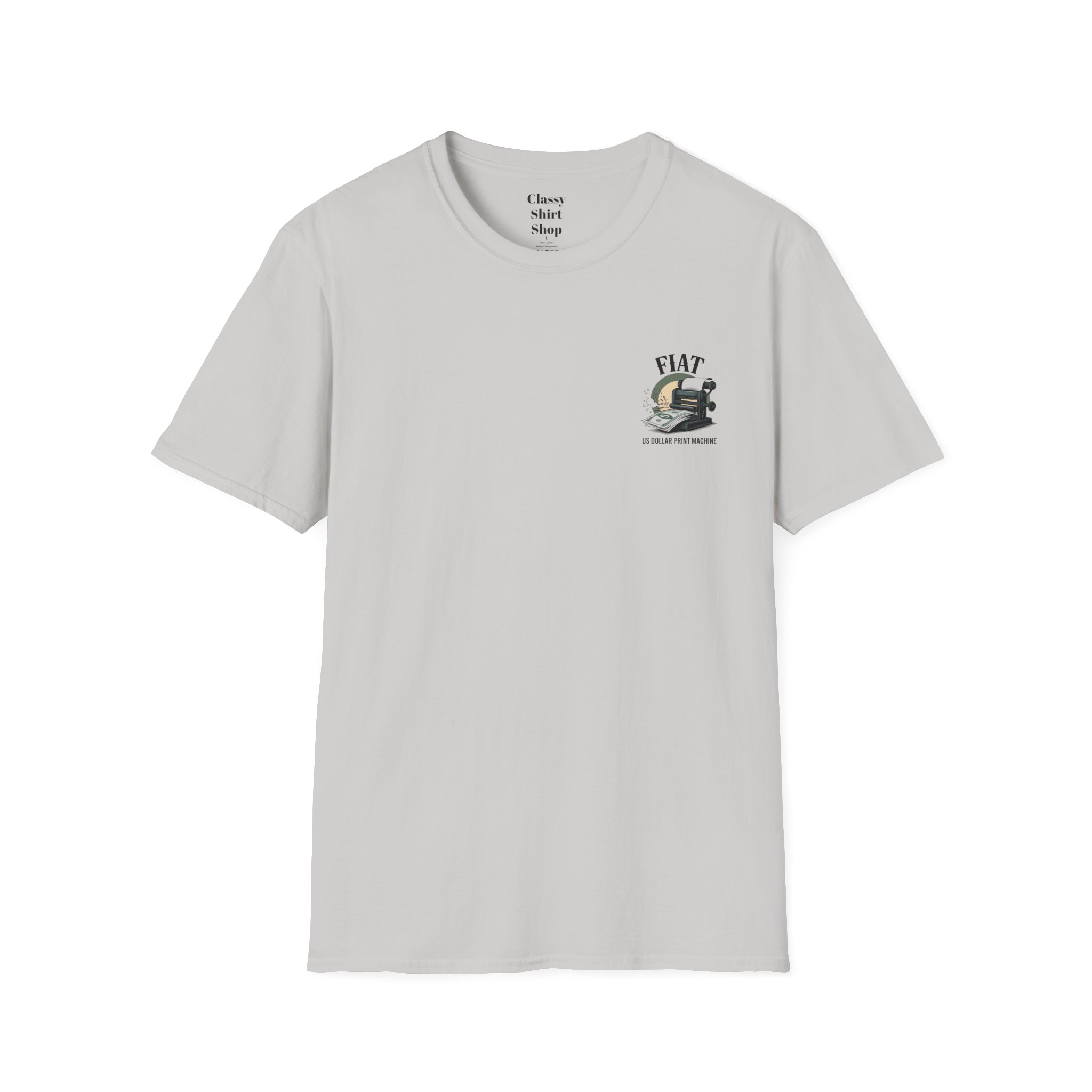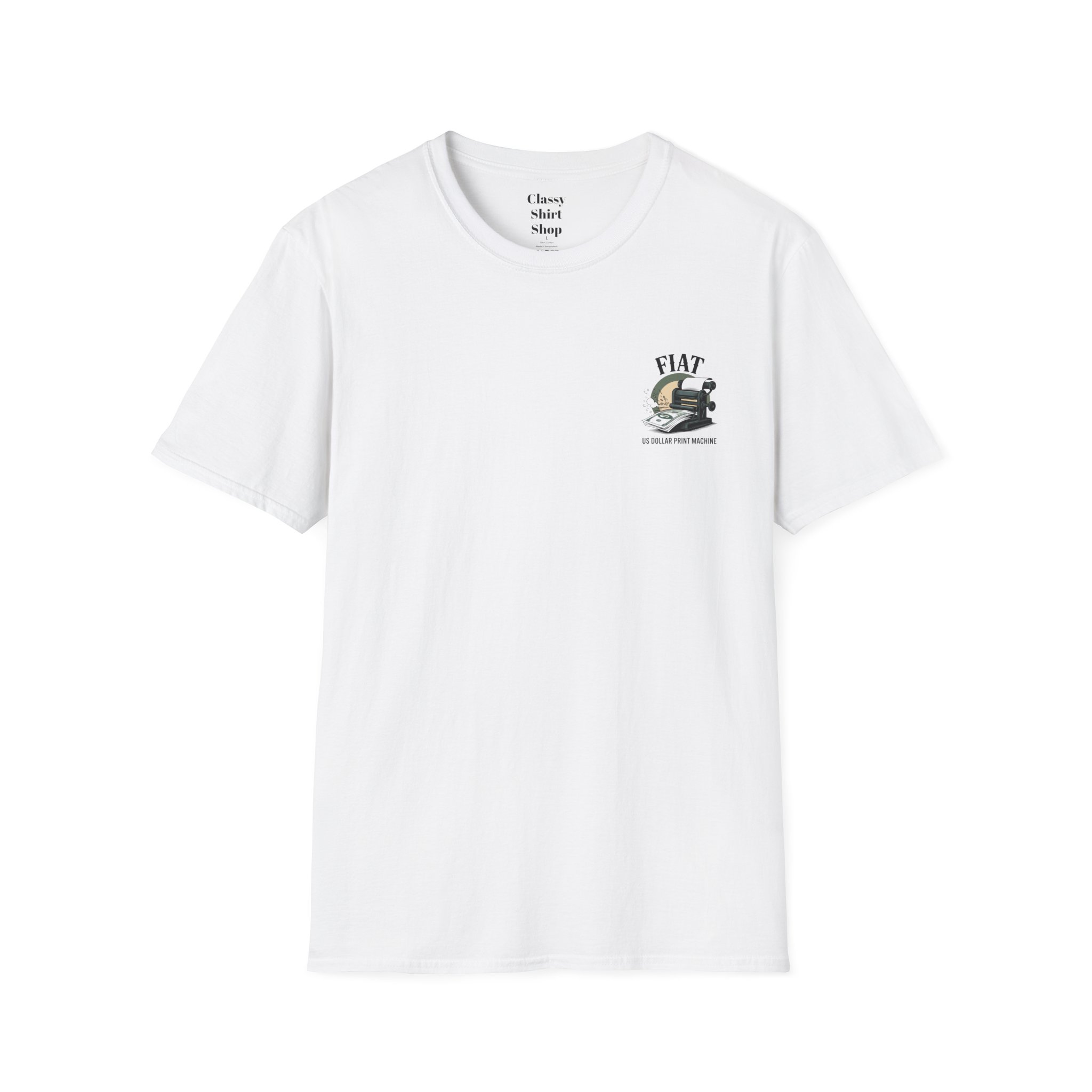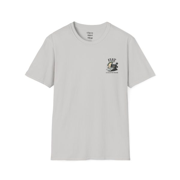 Lightweight, clean-cut tee with a retro, rebellious graphic that nods to monetary satire. The front chest carries a small emblem while the back shows a bold vintage printing press spitting out dollar bills under the headline “FIAT.” It wears like an everyday staple — soft, breathable ring-spun cotton that settles smooth against the skin and carries prints with crisp detail. The subtle natural texture in unprocessed shades adds character, and the ribbed crew neck and shoulder taping keep the silhouette steady after washes. Wear it to spark conversation, lean into political or economic humor, or layer it under a jacket for an effortless street-ready look.