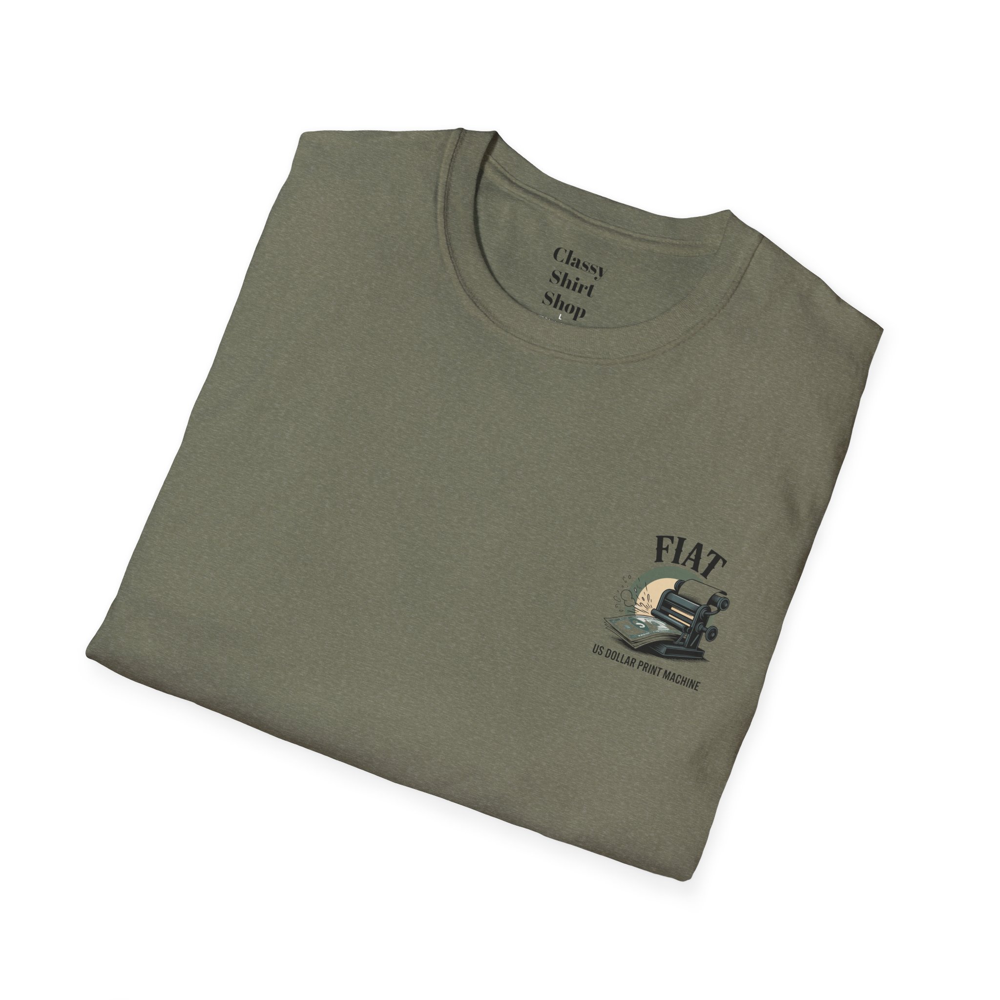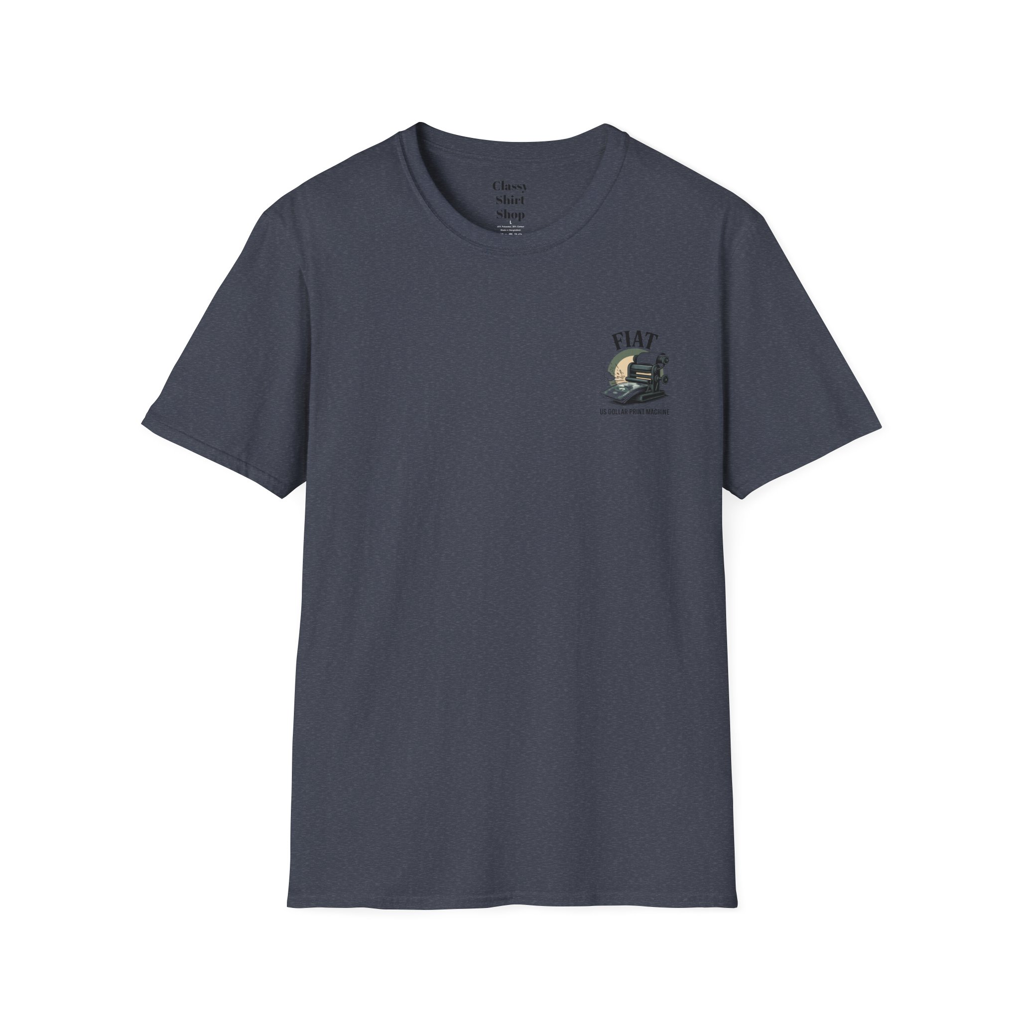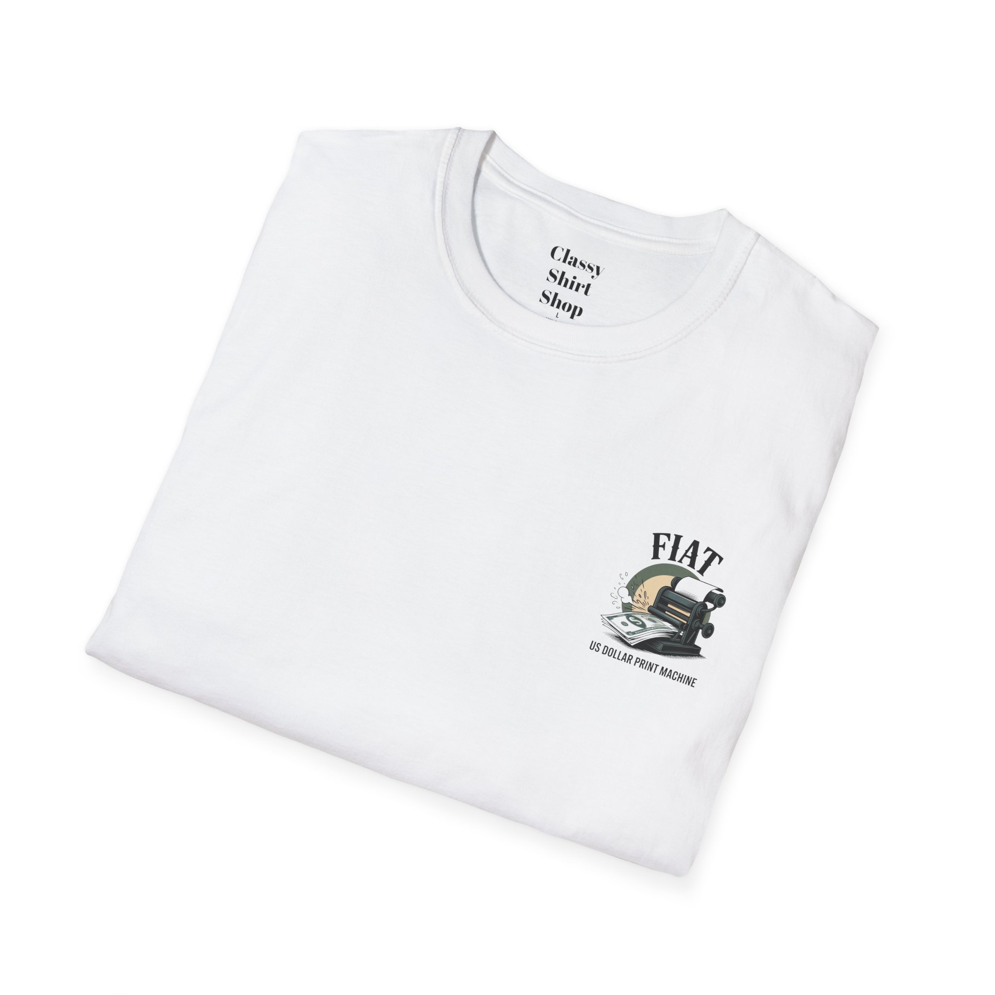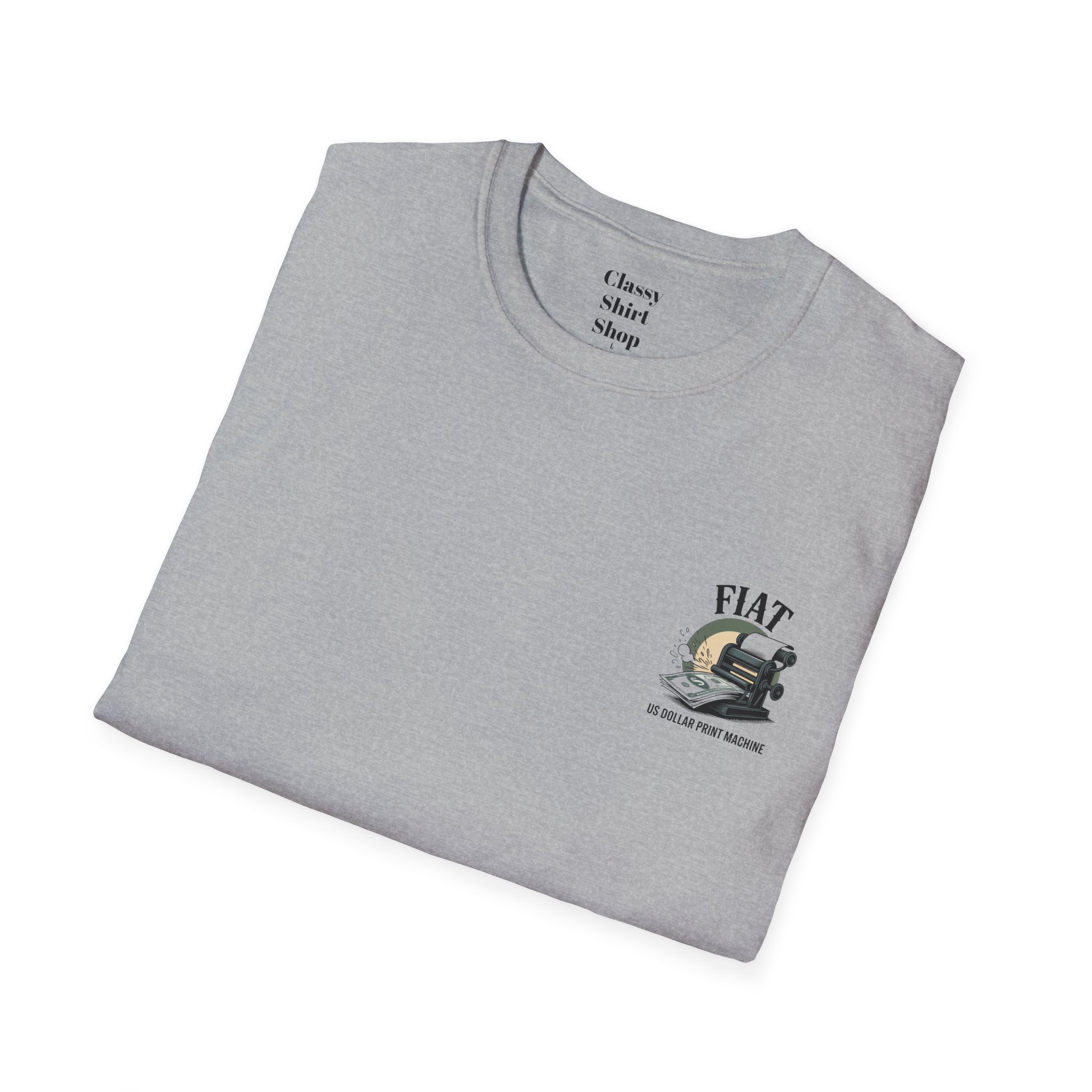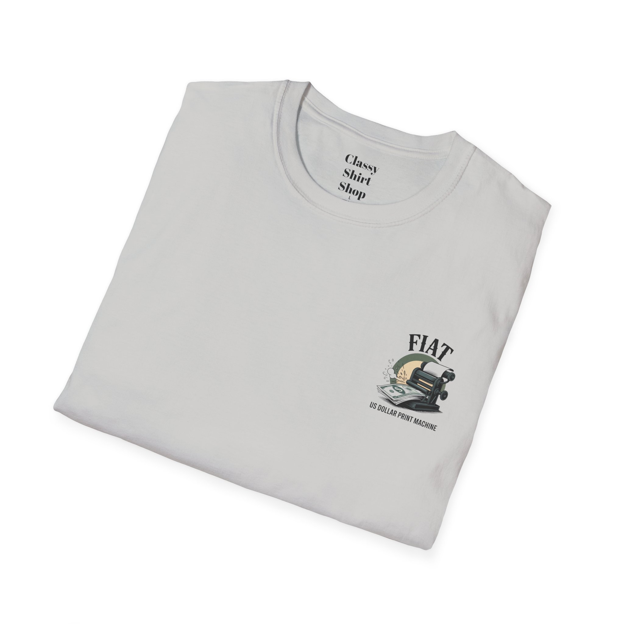 Lightweight, clean-cut tee with a retro, rebellious graphic that nods to monetary satire. The front chest carries a small emblem while the back shows a bold vintage printing press spitting out dollar bills under the headline “FIAT.” It wears like an everyday staple — soft, breathable ring-spun cotton that settles smooth against the skin and carries prints with crisp detail. The subtle natural texture in unprocessed shades adds character, and the ribbed crew neck and shoulder taping keep the silhouette steady after washes. Wear it to spark conversation, lean into political or economic humor, or layer it under a jacket for an effortless street-ready look.