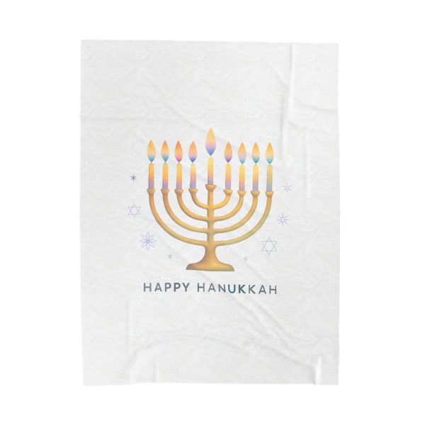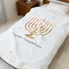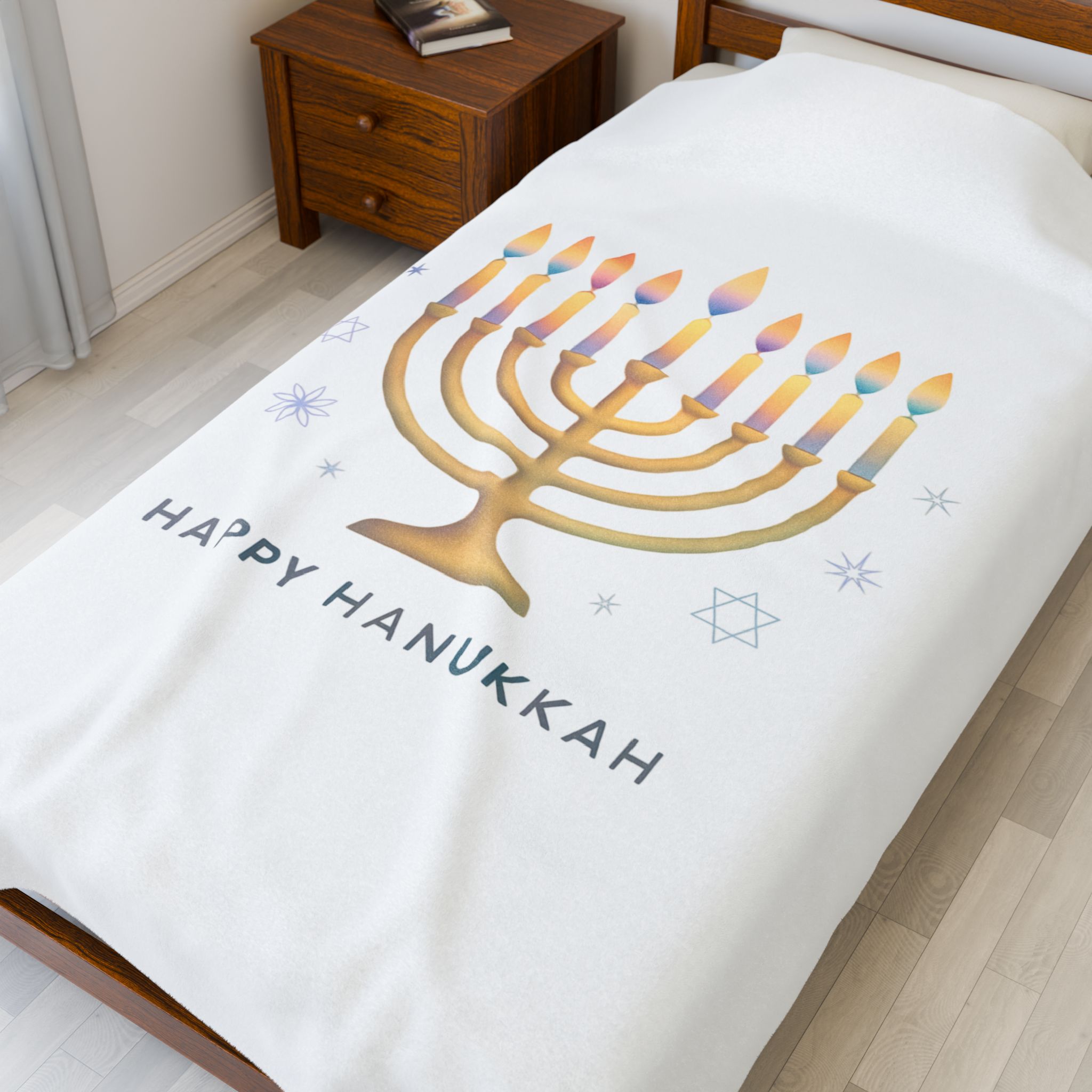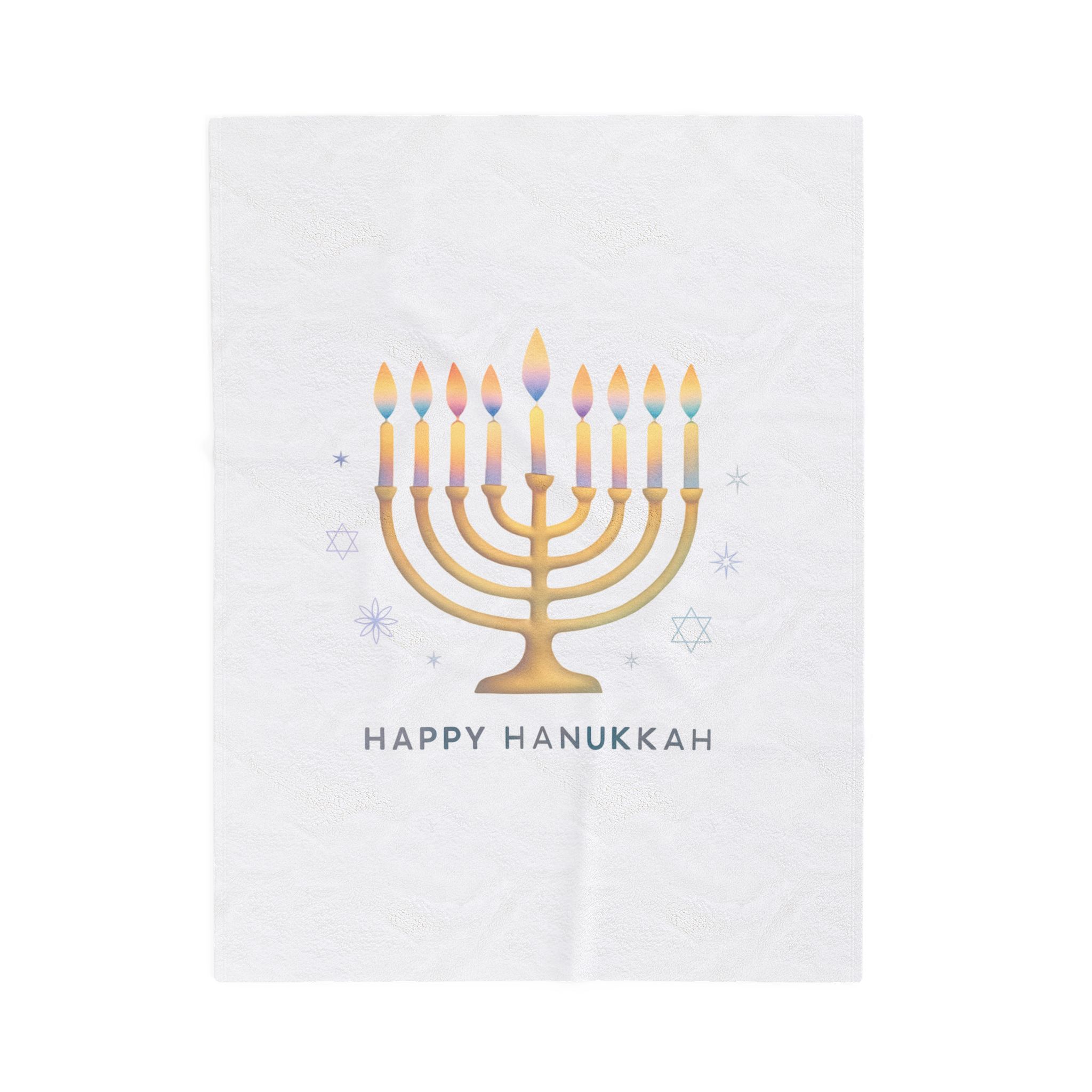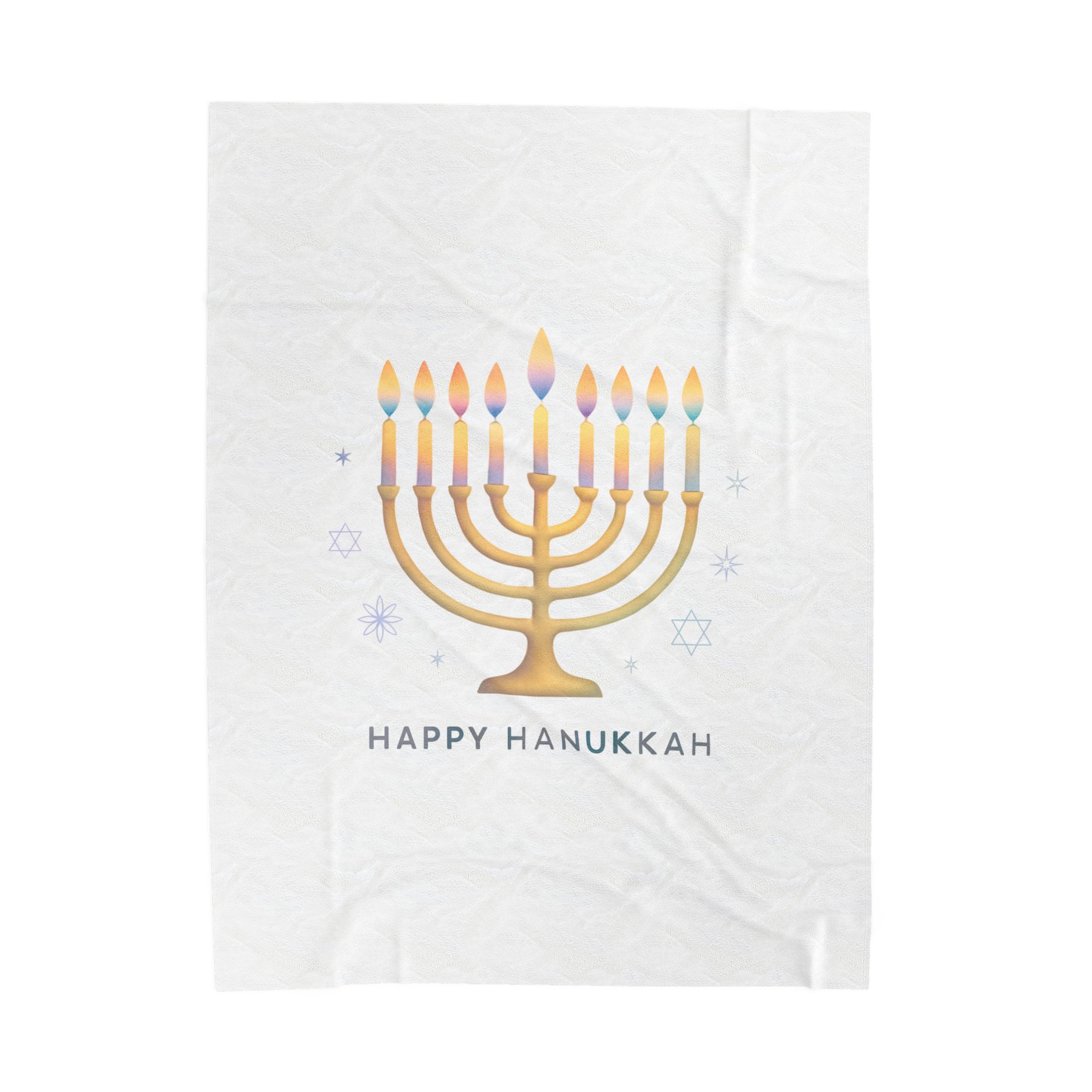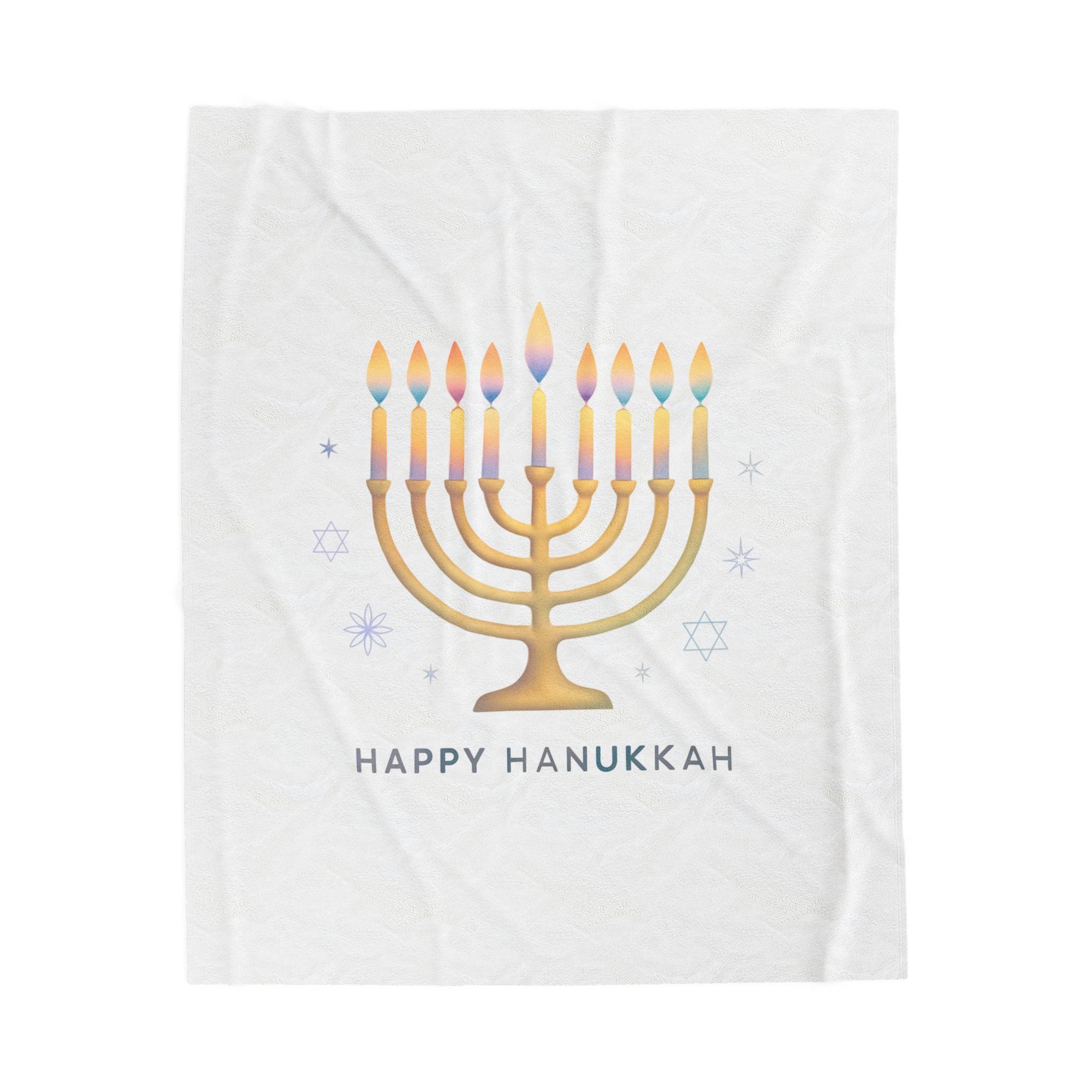 Warmth wrapped in tradition. This velveteen plush blanket carries a soft, cushiony touch that invites quiet evenings by the menorah. A gently illustrated menorah glows across one side in rich, lasting color — tiny Stars of David and flickering flames set a calm, celebratory scene without overpowering a room. Lightweight yet cozy, it drapes easily over laps or couches and brings a subtle, reverent note to Hanukkah gatherings, late-night reading, or relaxed family time. The double-stitched edges add durability so the blanket keeps its shape and comfort year after year.