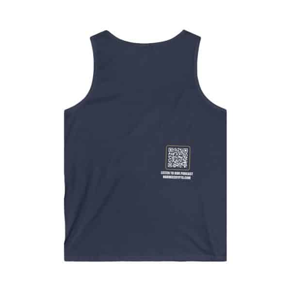 Lightweight and sleek, this tank brings crypto-culture into everyday wear. The front sports a bold circular badge with a rocket, coins and the rallying lines “Never Panic — Always HODL,” giving the piece a confident, rallying energy. The back carries a small QR code for quick access to a related podcast/website, a discreet nod that this is more than just a shirt — it’s a conversation starter. The sleeveless cut and smooth self-fabric binding create a clean silhouette that layers easily under hoodies or stands alone on warmer days. Breathable ringspun cotton and a tear-away label ensure comfort during long meetups, gym sessions, or casual hangs. Subtle details like tubular knit construction and a sleeker fit keep the look modern and polished while staying lightweight for year-round wear.