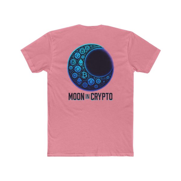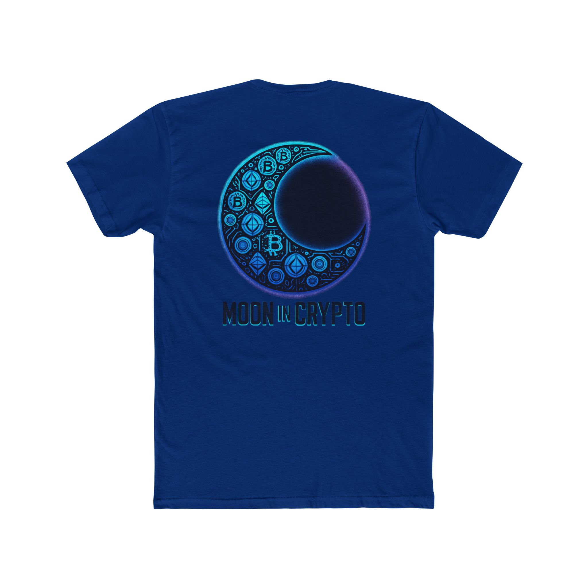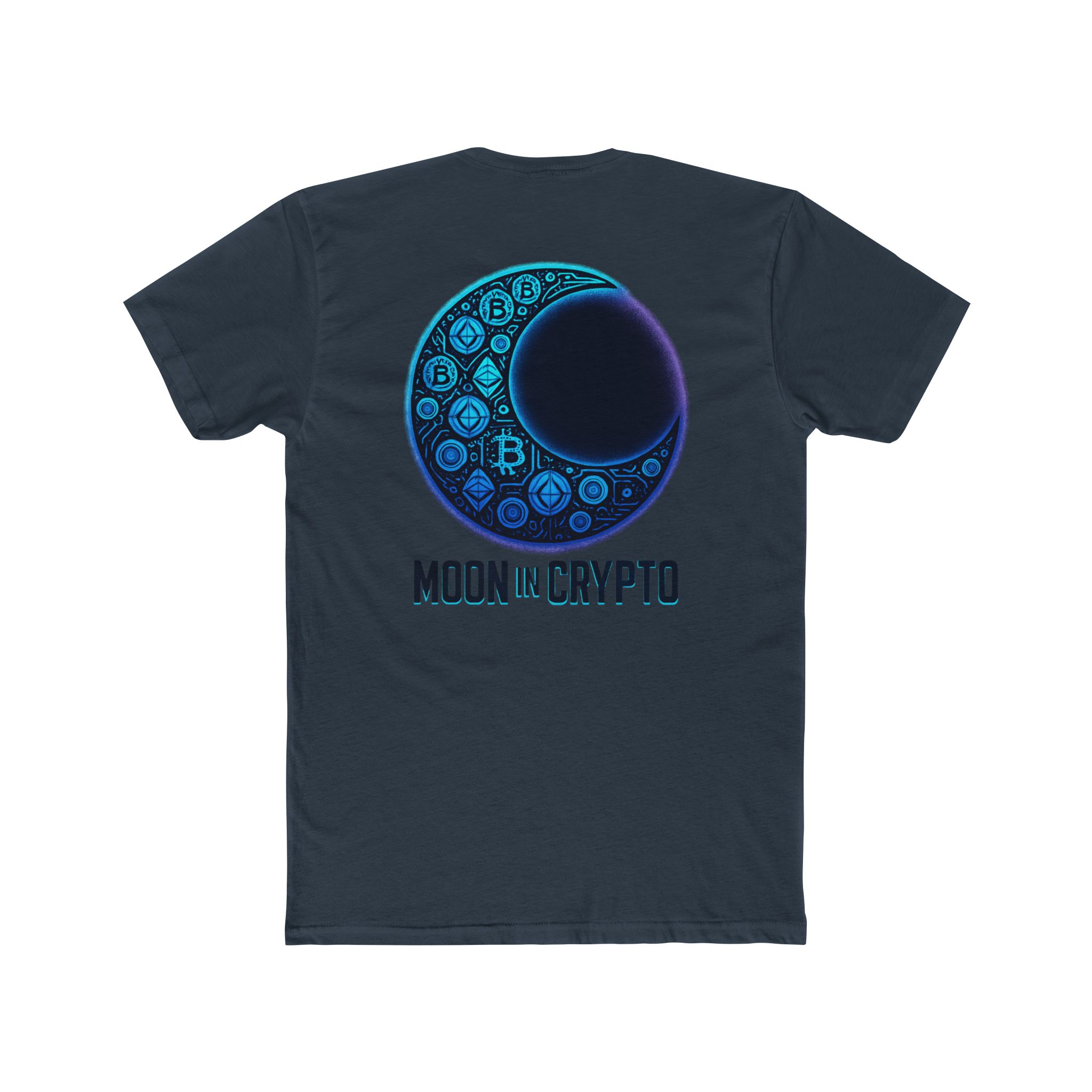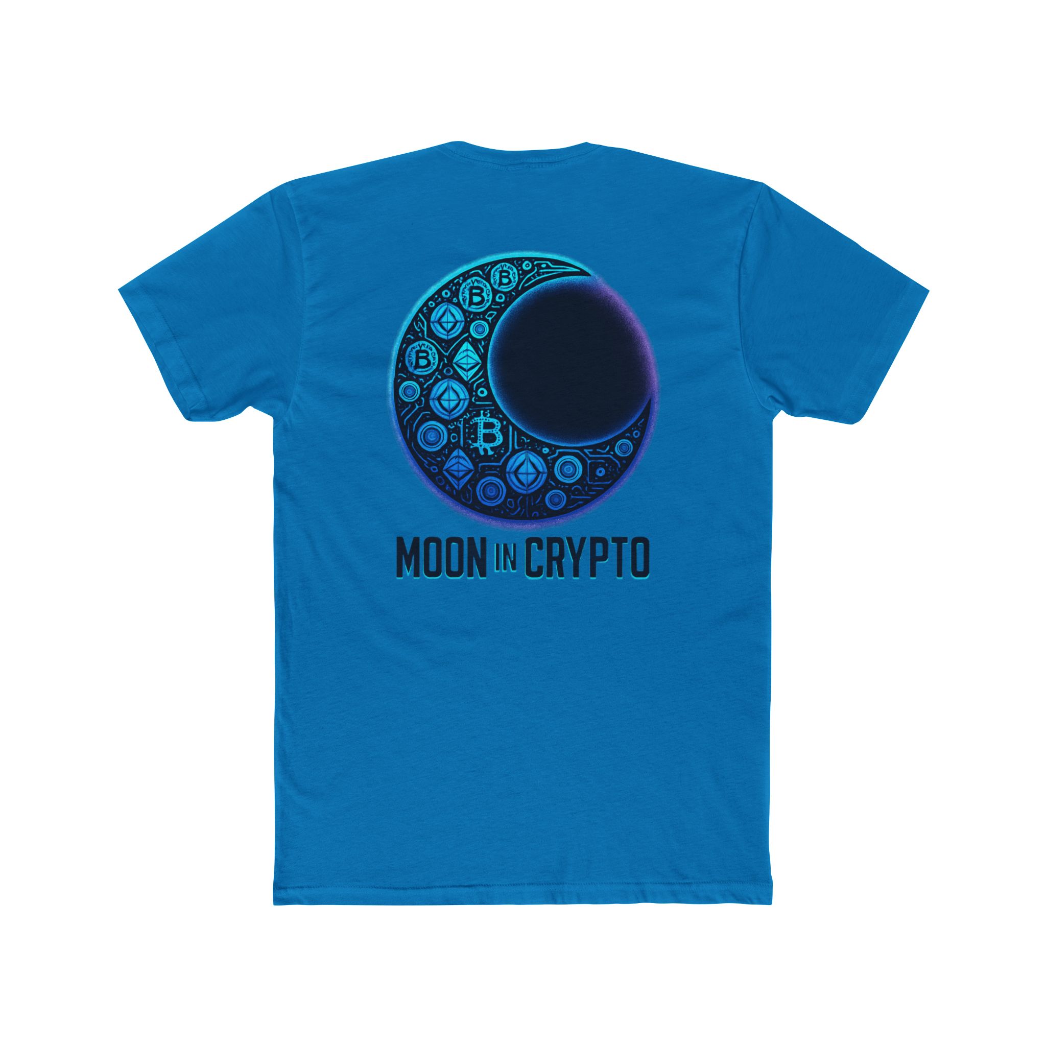 Soft, lightweight cotton with a clean crew neckline carries a bold, space‑themed crypto print that feels like a nod to late‑night market watching and long bets on the next big surge. The front chest shows a small emblem while the back displays a luminous moon composed of crypto icons and the phrase “MOON IN CRYPTO.” Wear it to chat strategy with fellow traders, stream market updates, or simply show your quiet confidence in blockchain futures. The fit is classic and easy to layer — pair it with hoodies, denim, or a blazer when you want the look to lean smarter. Subtle construction details like ribbed collar, shoulder tape, and side seams keep the tee looking sharp after many wears and washes.