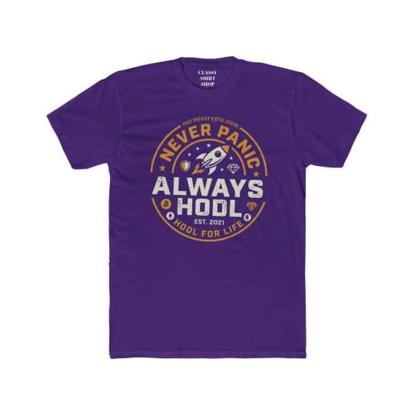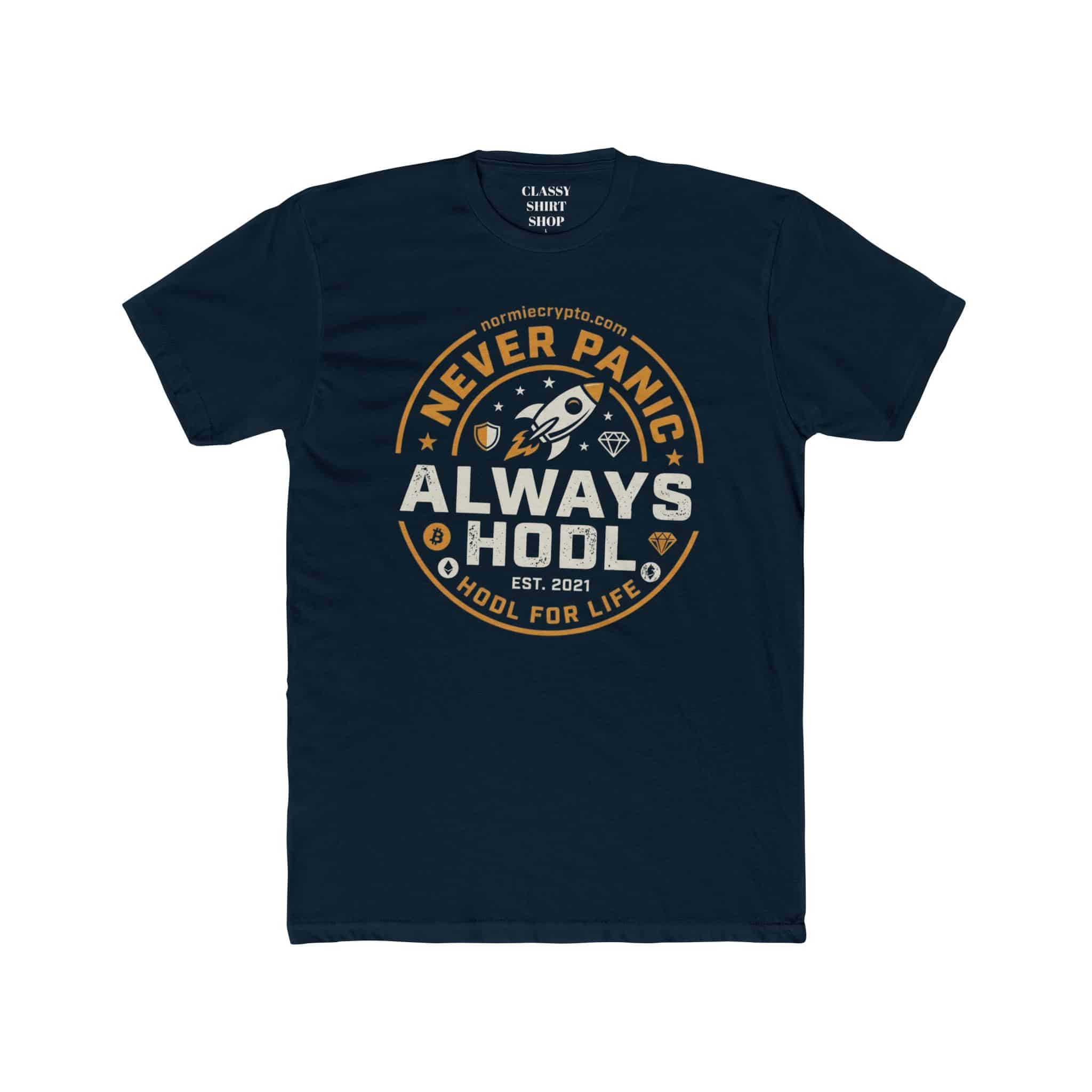This soft, lightweight crew tee carries quiet confidence for anyone who lives by the long game. The front features a vintage-style emblem: a rocket rising above the words “Never Panic — Always HODL,” rendered in warm, worn-in tones that feel lived in. On the back a small, discreet QR-code print sits low on the spine — a modern nod to community and story. Wear it to trading meetups, late-night strategy sessions, or casual weekends when you want your values on your chest without shouting.